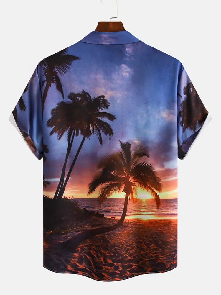 • Eye-Catching Psychedelic Beach Purple Hawaiian Coconut Tree Print Short Sleeve Shirt