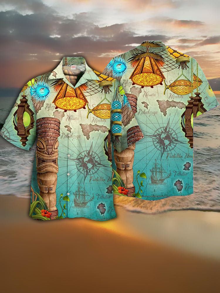 • Eye-Catching Mystery Culture Vintage Sailing Ship And Tiki World Map Printing Cuban Collar Hawaiian Short Sleeve Shirt