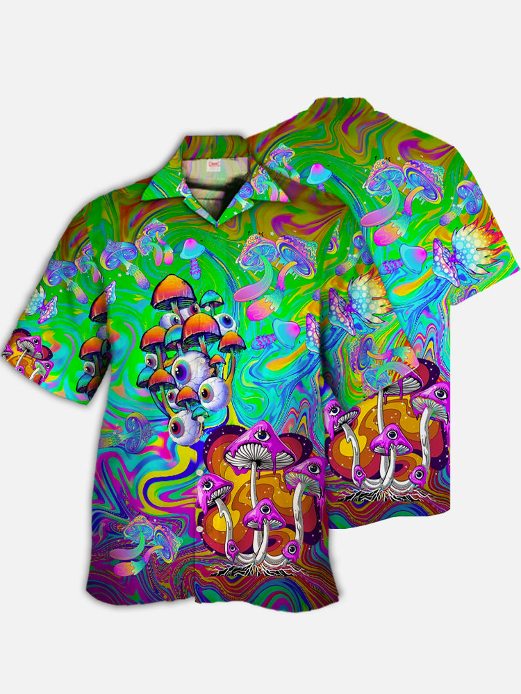 • Eye-Catching Psychedelic Colorful Hippie Mushroom Printing Cuban Collar Hawaiian Short Sleeve Shirt