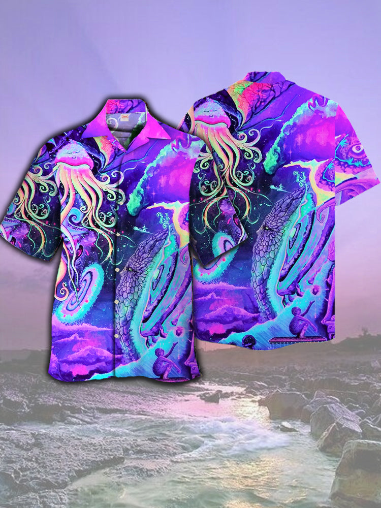• Eye-Catching Psychedelic Colorful Hippie Jellyfish Printing Cuban Collar Hawaiian Short Sleeve Shirt