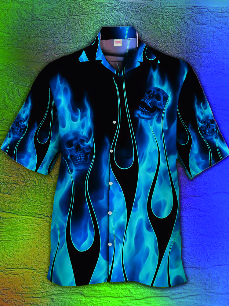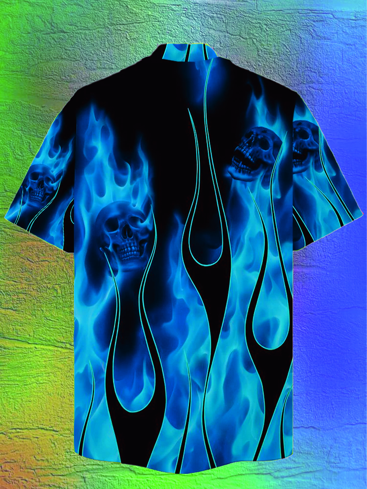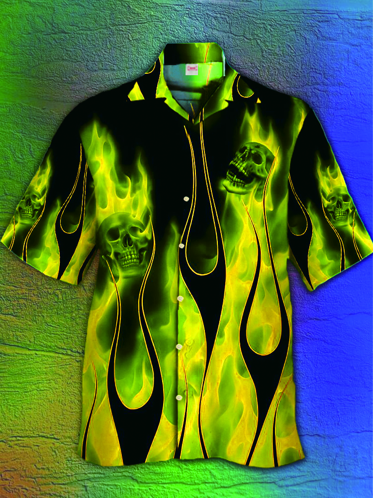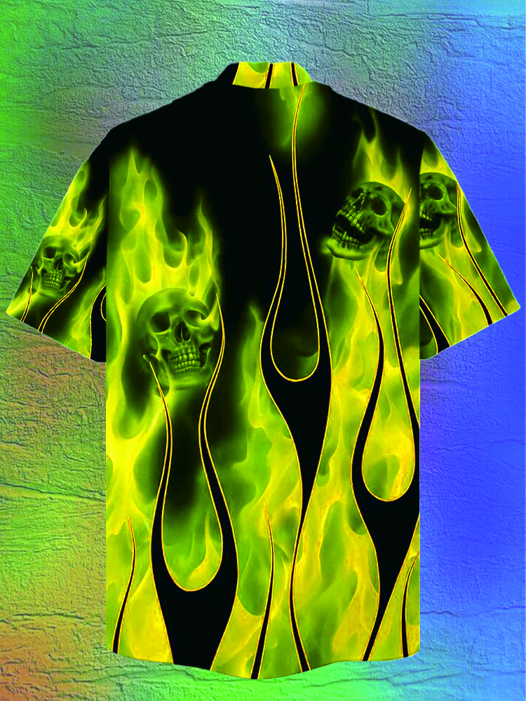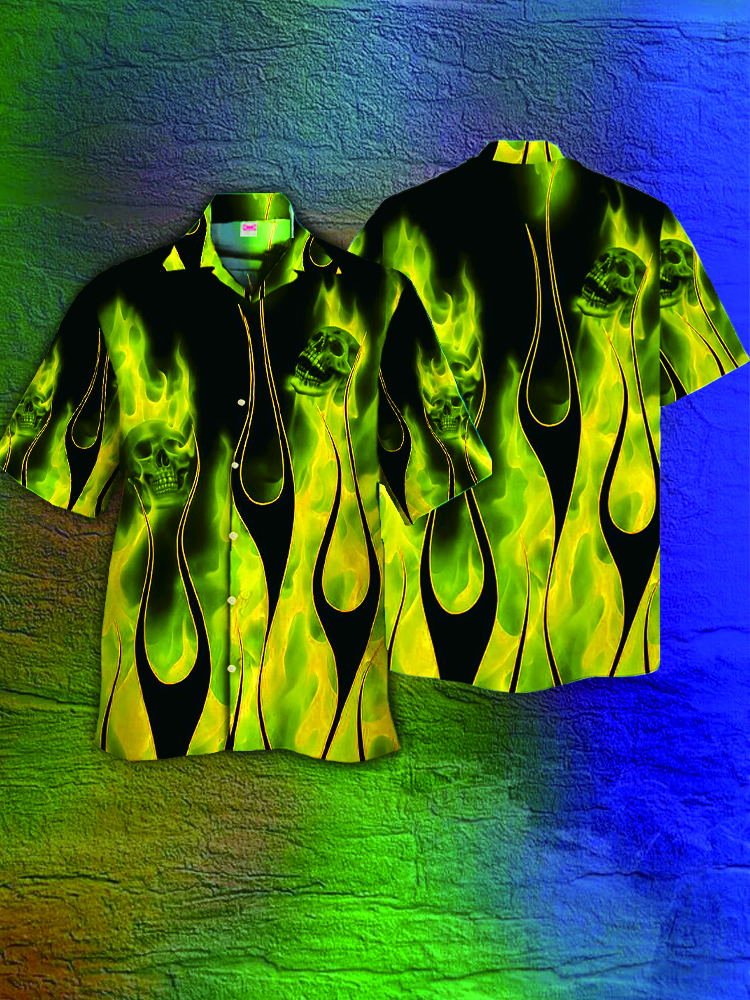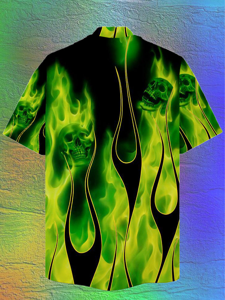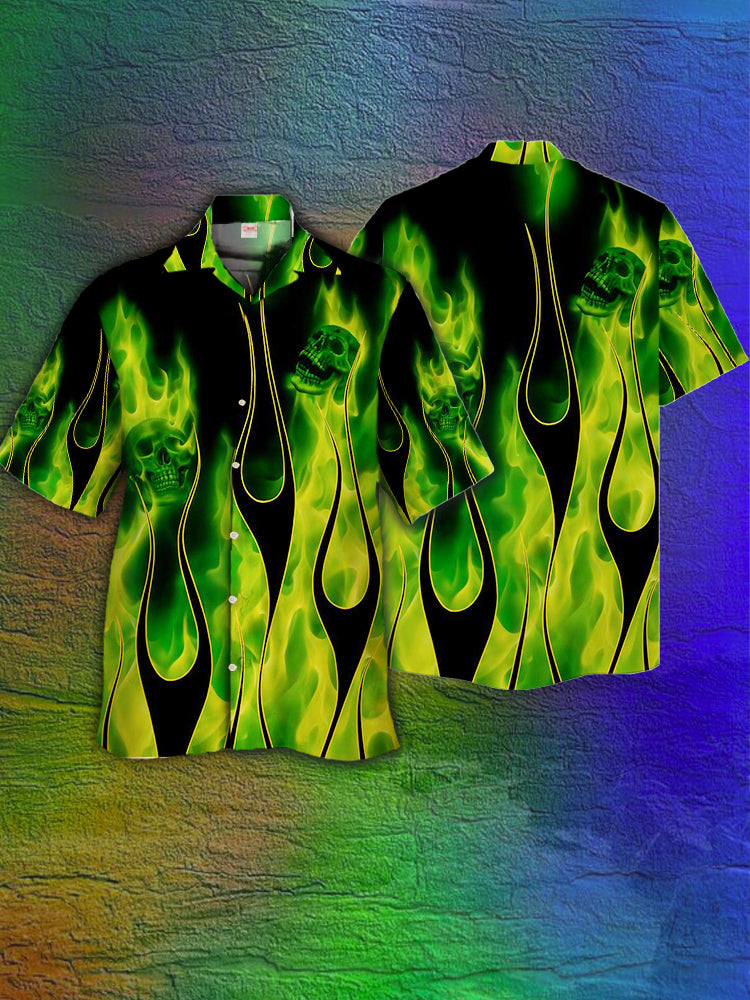 Eye-Catching Psychedelic Green Fire Flame Pattern Printing Cuban Collar Hawaiian Short Sleeve Shirt