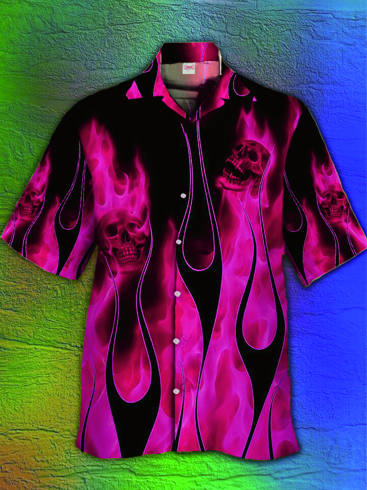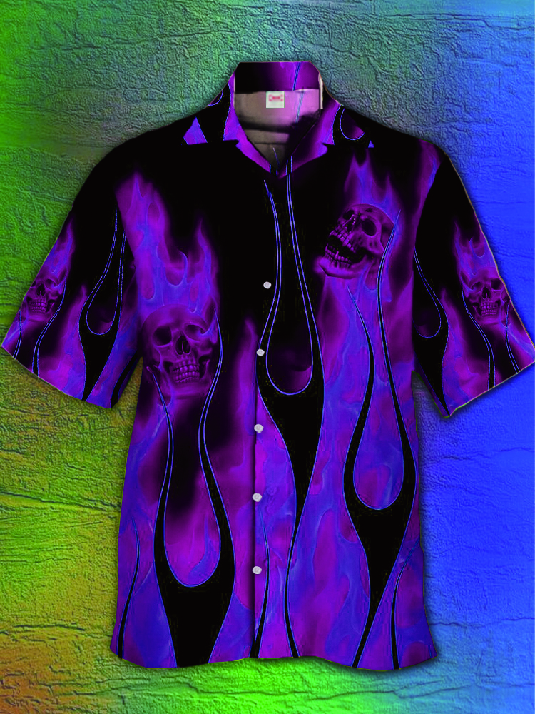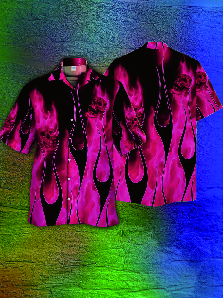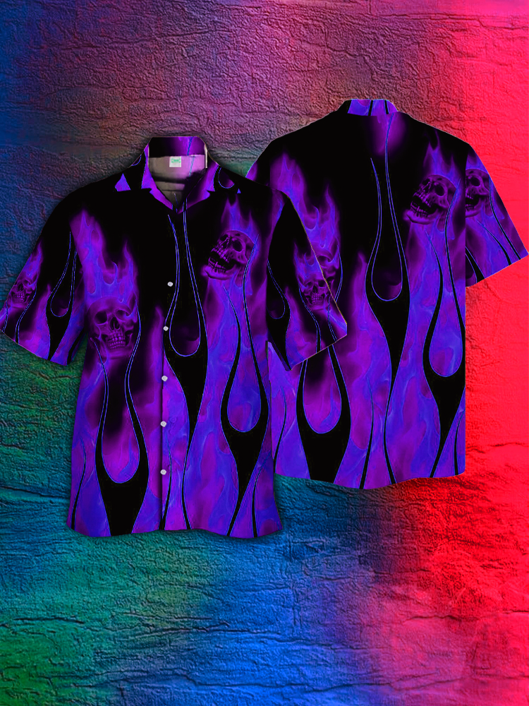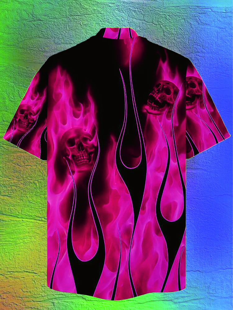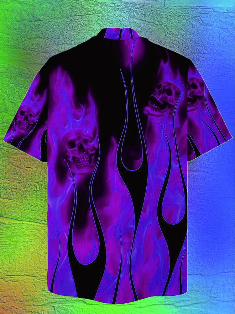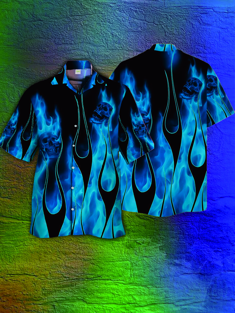 Eye-Catching Psychedelic Green Fire Flame Pattern Printing Cuban Collar Hawaiian Short Sleeve Shirt