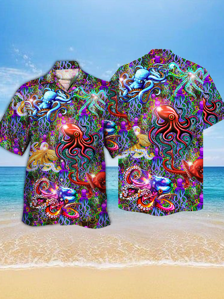 • Eye-Catching Psychedelic Stunning Hippie Colored Octopus Printing Cuban Collar Hawaiian Short Sleeve Shirt