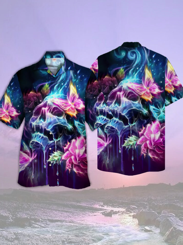 • Eye-Catching Psychedelic Colorful Wicked Skulls Printing Cuban Collar Hawaiian Short Sleeve Shirt