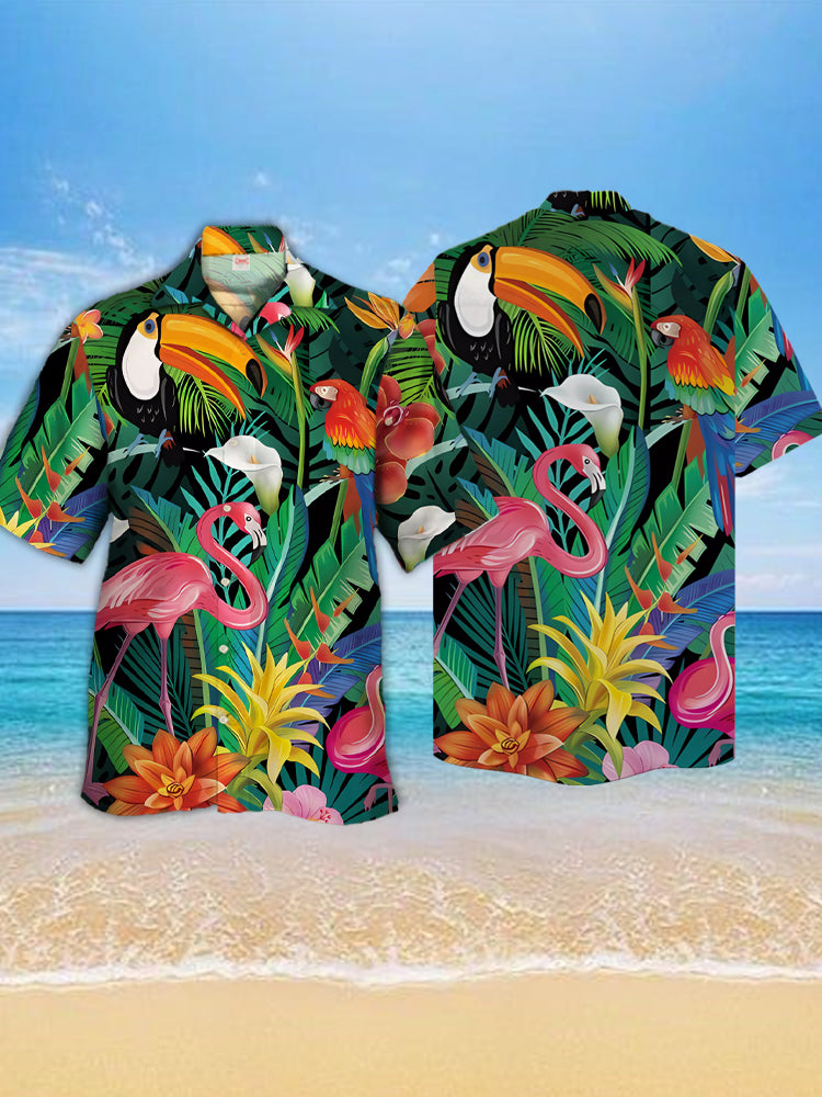 • Eye-Catching Full-Print Animalistic Design Hand Painted Pink Flamingo And Toucan Printing Cuban Collar Hawaiian Short Sleeve Shirt