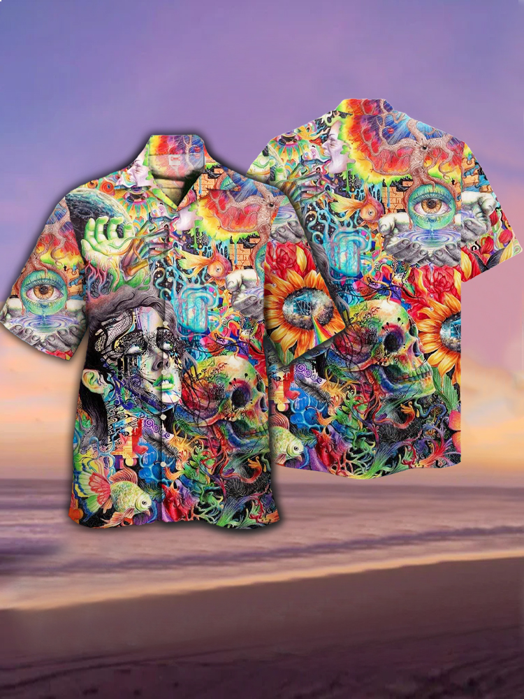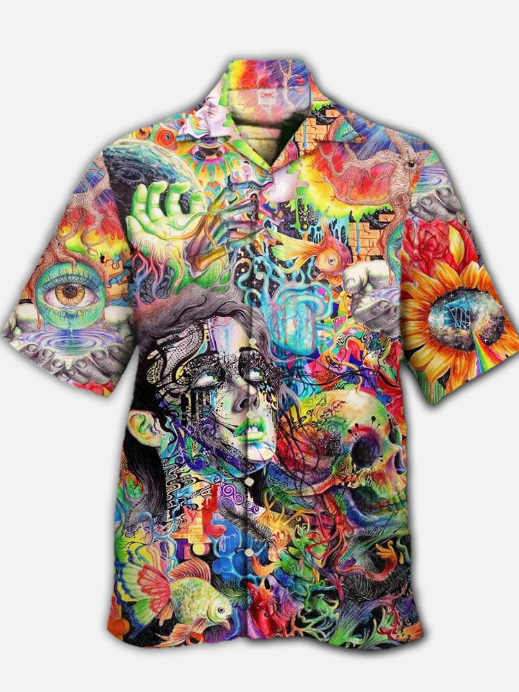 • Eye-Catching Crazy Art Stream Psychedelic Dimensions Skull Tropical Hawaiian Cuban Collar Short Sleeve Shirt