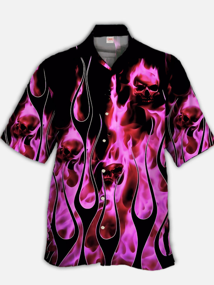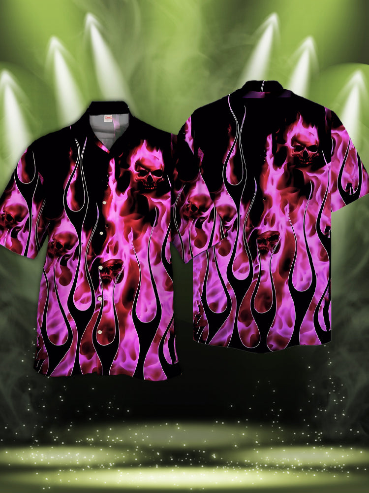 • Eye-Catching Pink Flames And Skulls In The Dark Printing Cuban Collar Hawaiian Short Sleeve Shirt