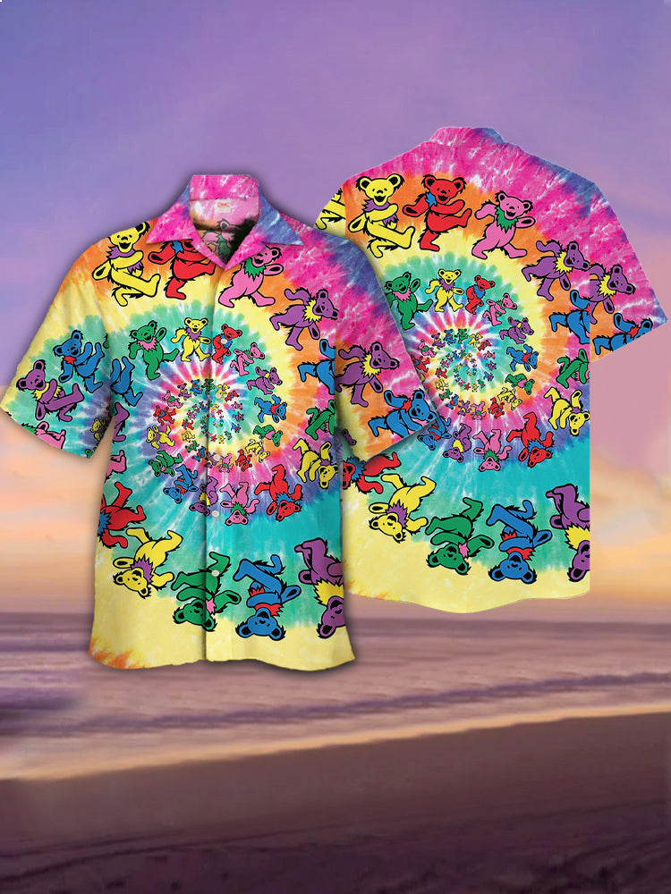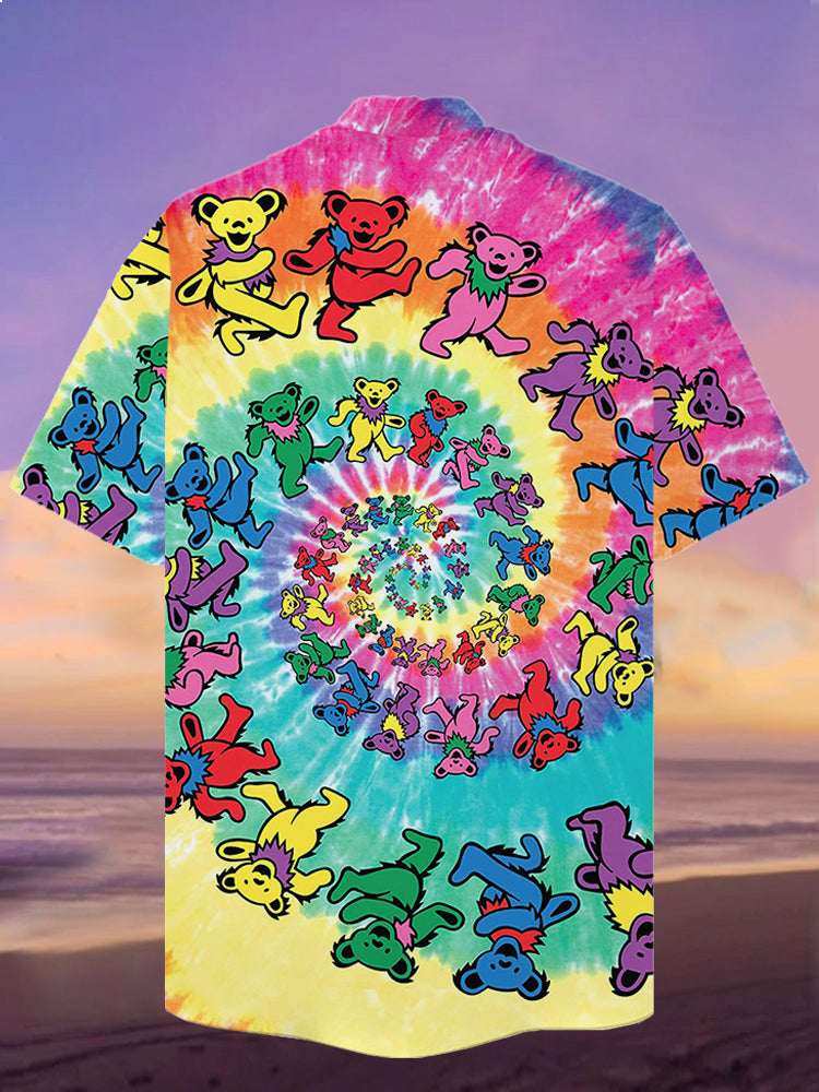• Eye-Catching Psychedelic Colorful Tie-Dye Ink Splashing Spiral Bear Printing Cuban Collar Hawaiian Short Sleeve Shirt