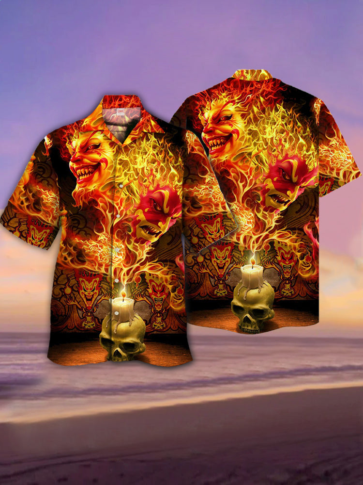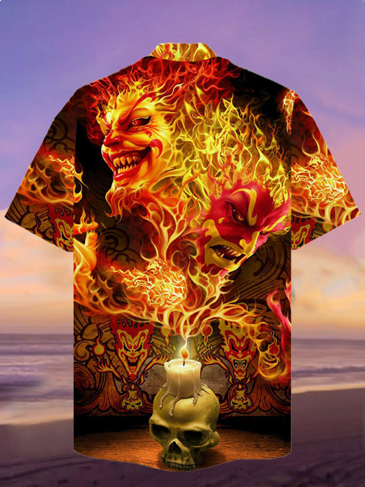 • Eye-Catching Amazing Style Magic Candle Flame Clown Skull Printing Cuban Collar Hawaiian Short Sleeve Shirt