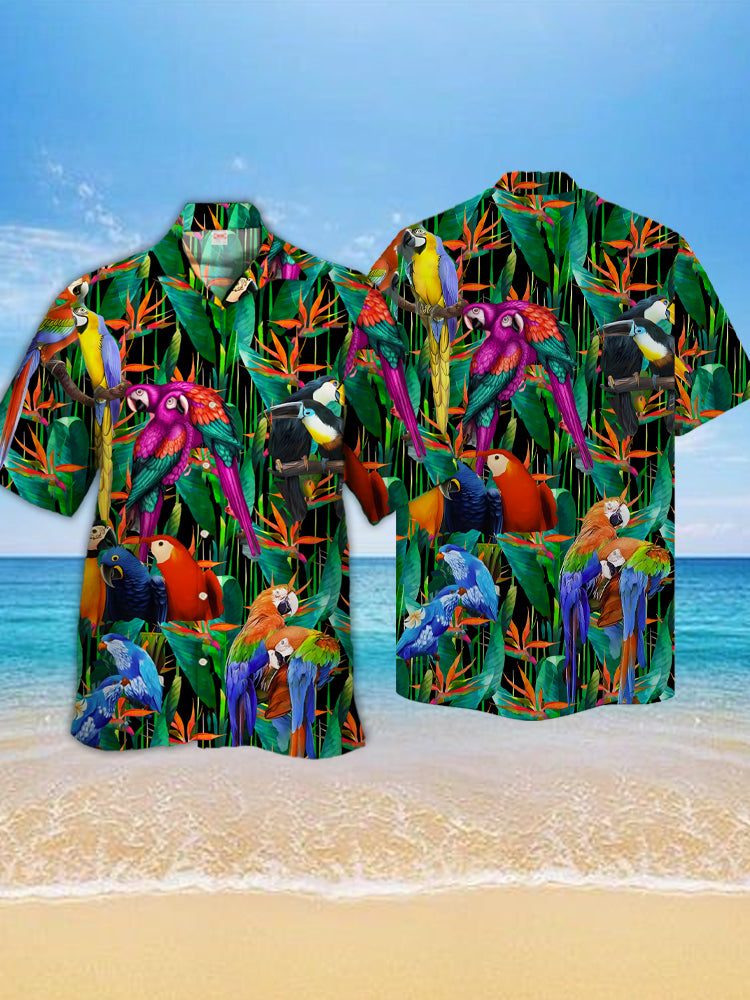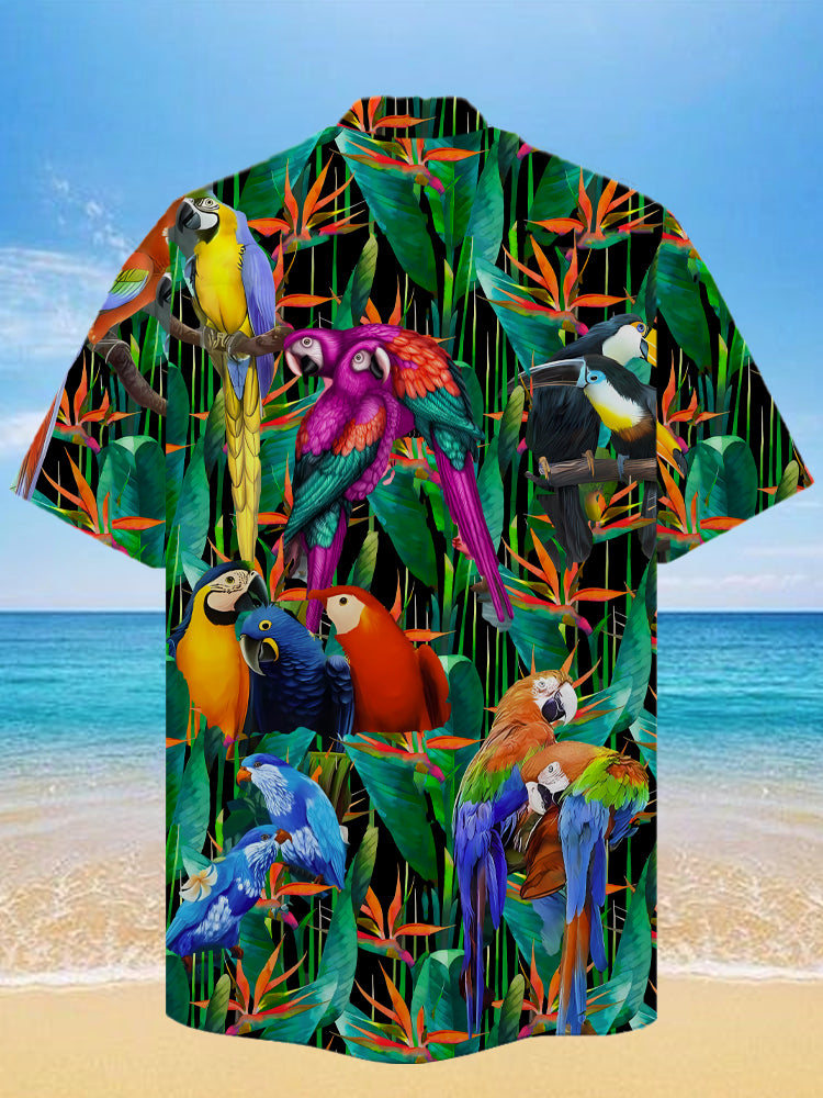 Eye-Catching Psychedelic Neon Colorful Tropical Foliage And Parrots Printing Cuban Collar Hawaiian Short Sleeve Shirt