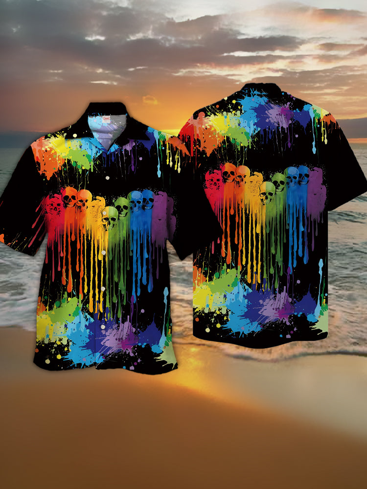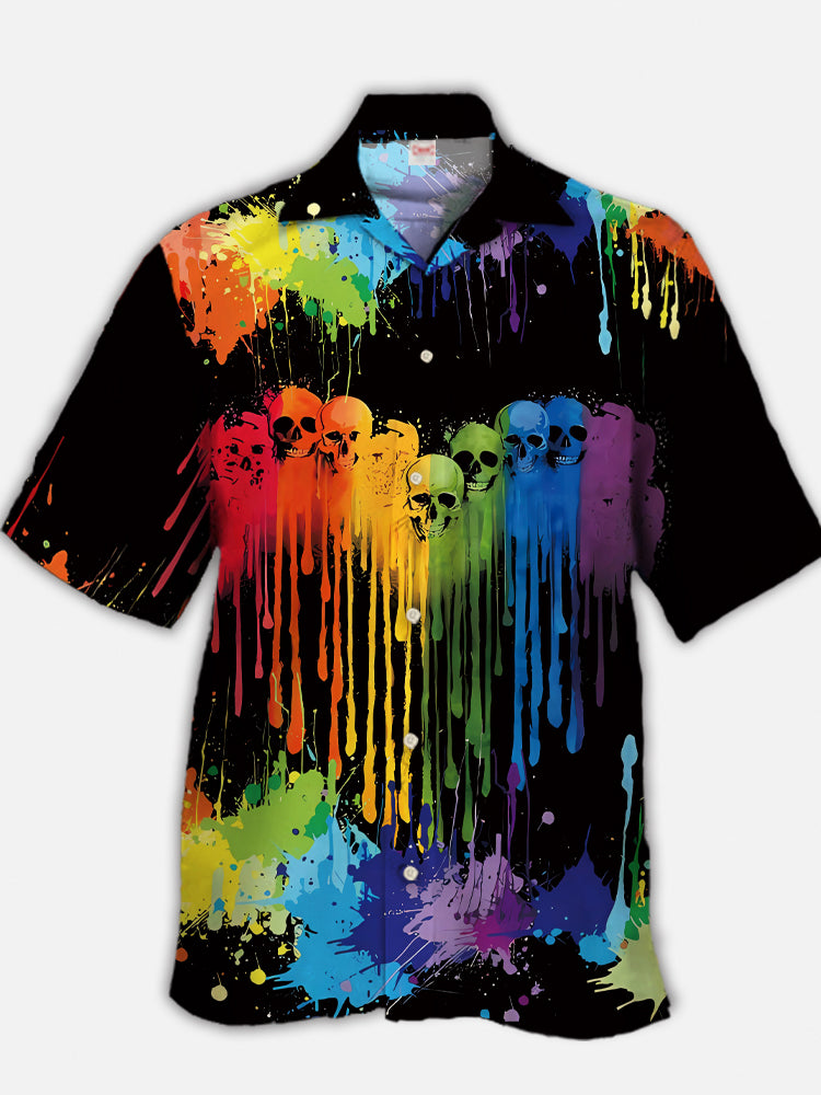 • Eye-Catching Rainbow Painting Paint Splatter Sugar Skull Printing Cuban Collar Hawaiian Short Sleeve Shirt