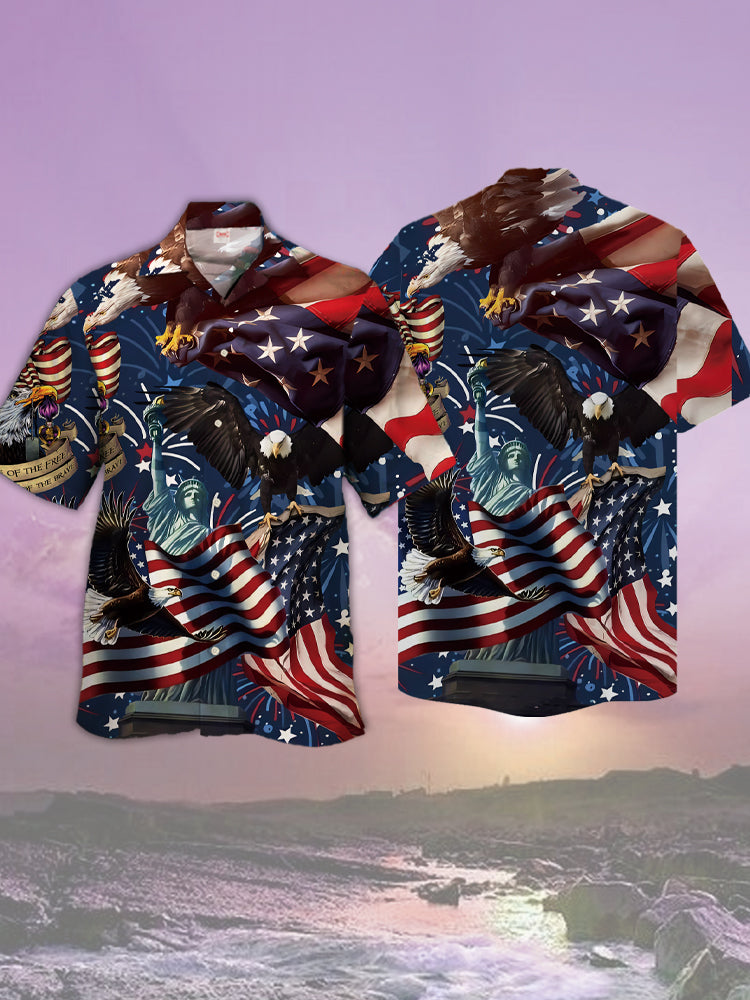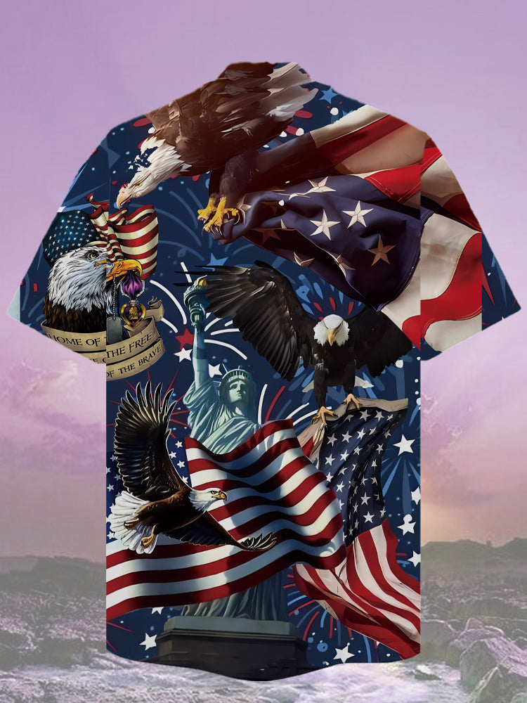 • Eye-catching American Flag Statue Of Liberty Eagle Printing Cuban Collar Hawaiian Short Sleeve Shirt