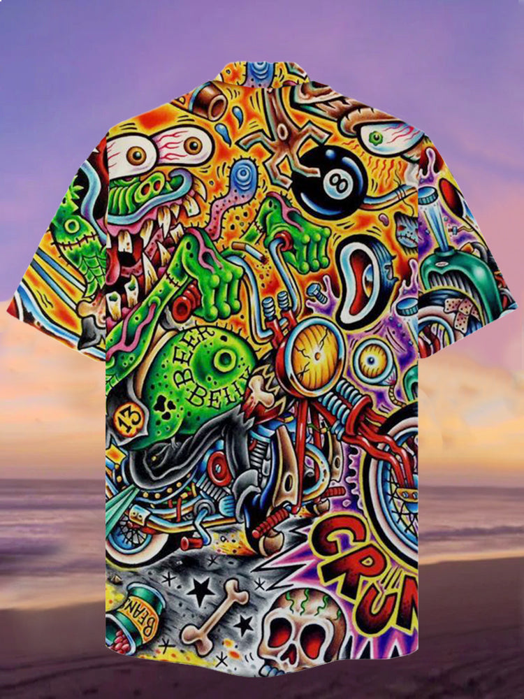 Eye-Catching Psychedelic Moto Skeleton Monster Printing Cuban Collar Hawaiian Short Sleeve Shirt