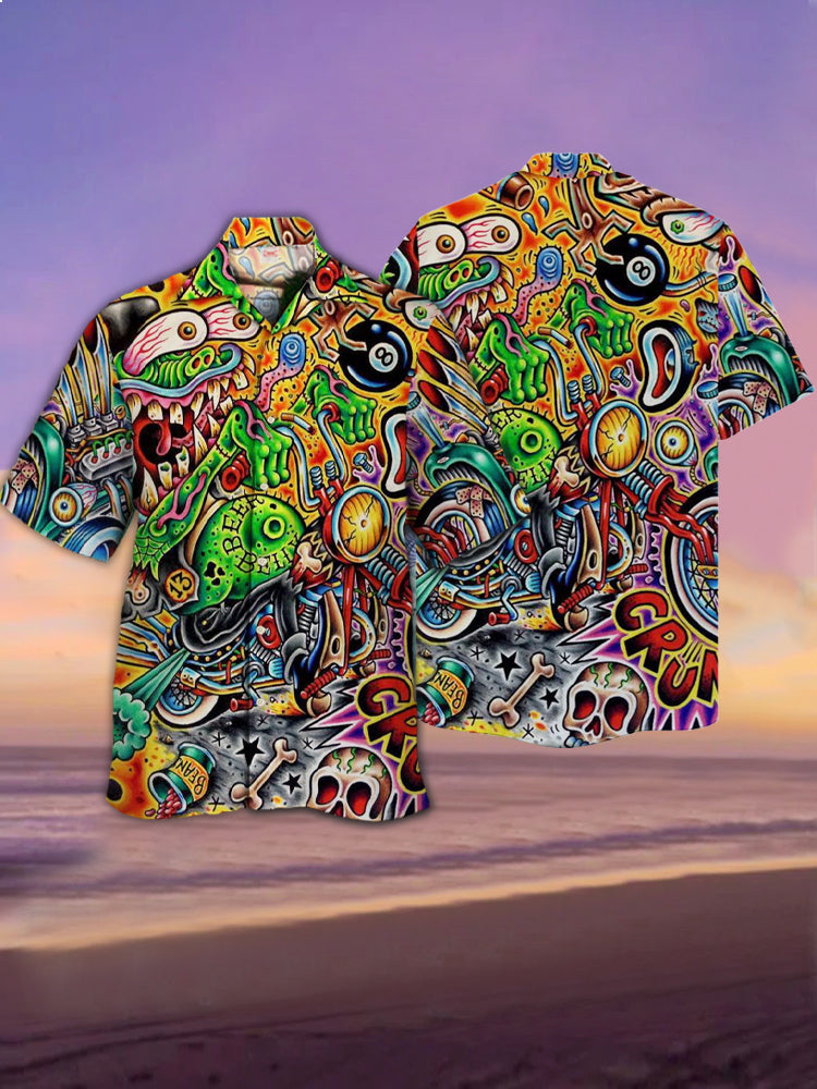 • Eye-Catching Psychedelic Moto Skeleton Monster Printing Cuban Collar Hawaiian Short Sleeve Shirt