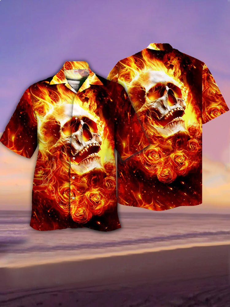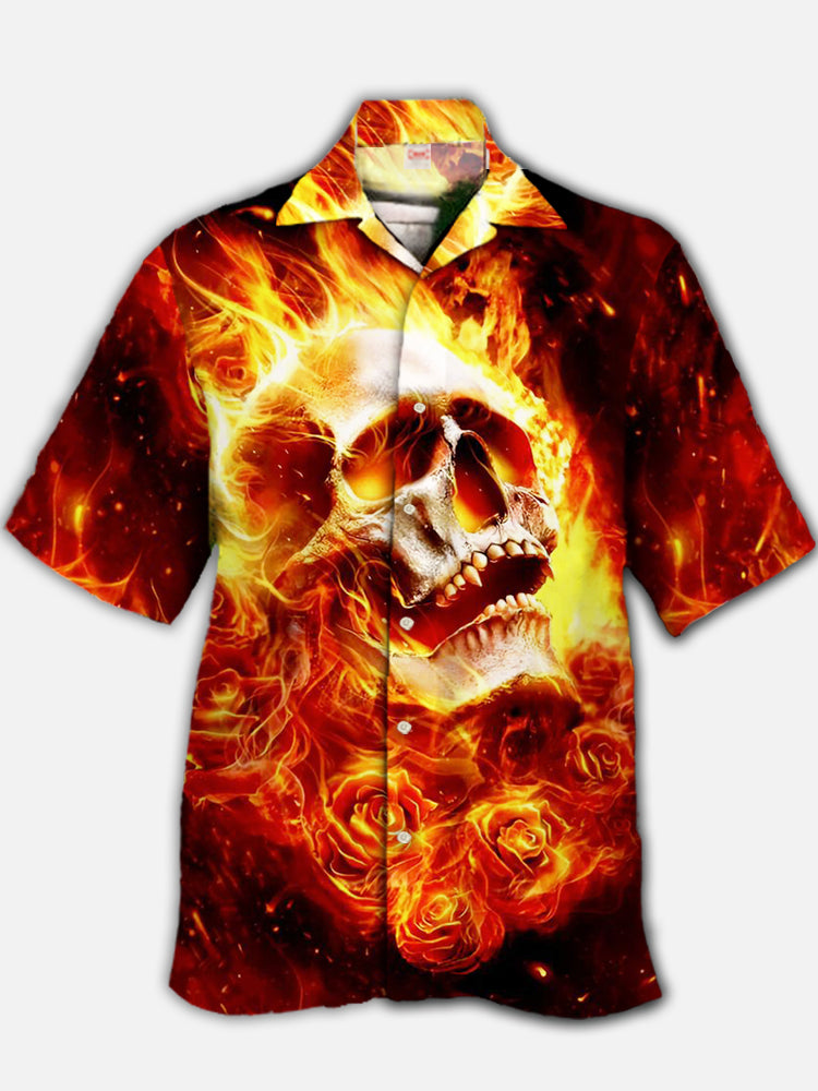 • Eye-Catching Amazing Style Skull In Fire Fire Rose Printing Cuban Collar Hawaiian Short Sleeve Shirt