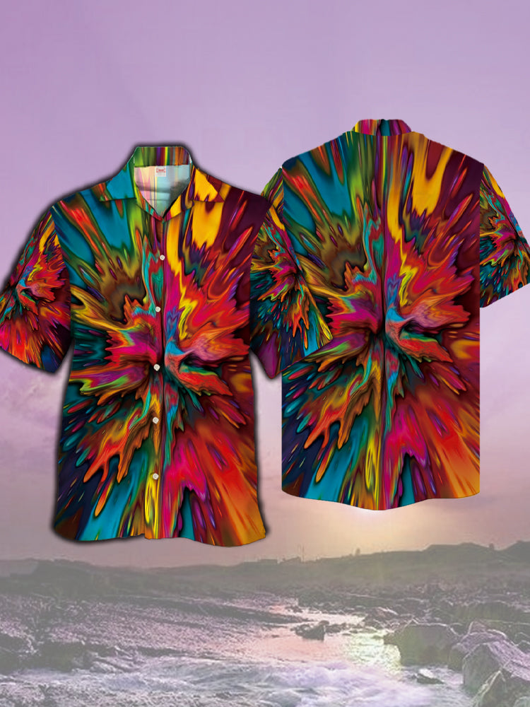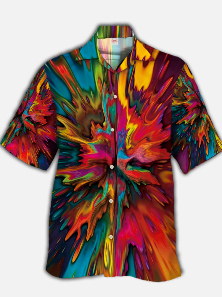 Eye-Catching Jet-like Colorful Mixed Paint Pattern Printing Cuban Collar Hawaiian Short Sleeve Shirt