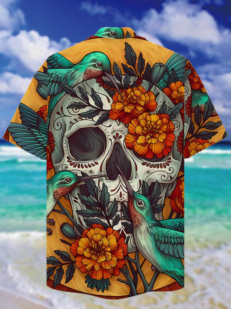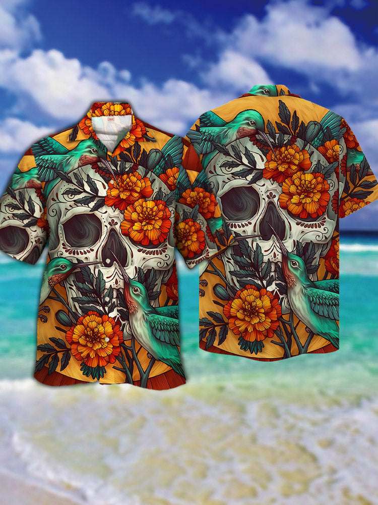 • Eye-Catching Gothic Romantic Skull Orange Flowers And Hummingbird Printing Cuban Collar Hawaiian Short Sleeve Shirt