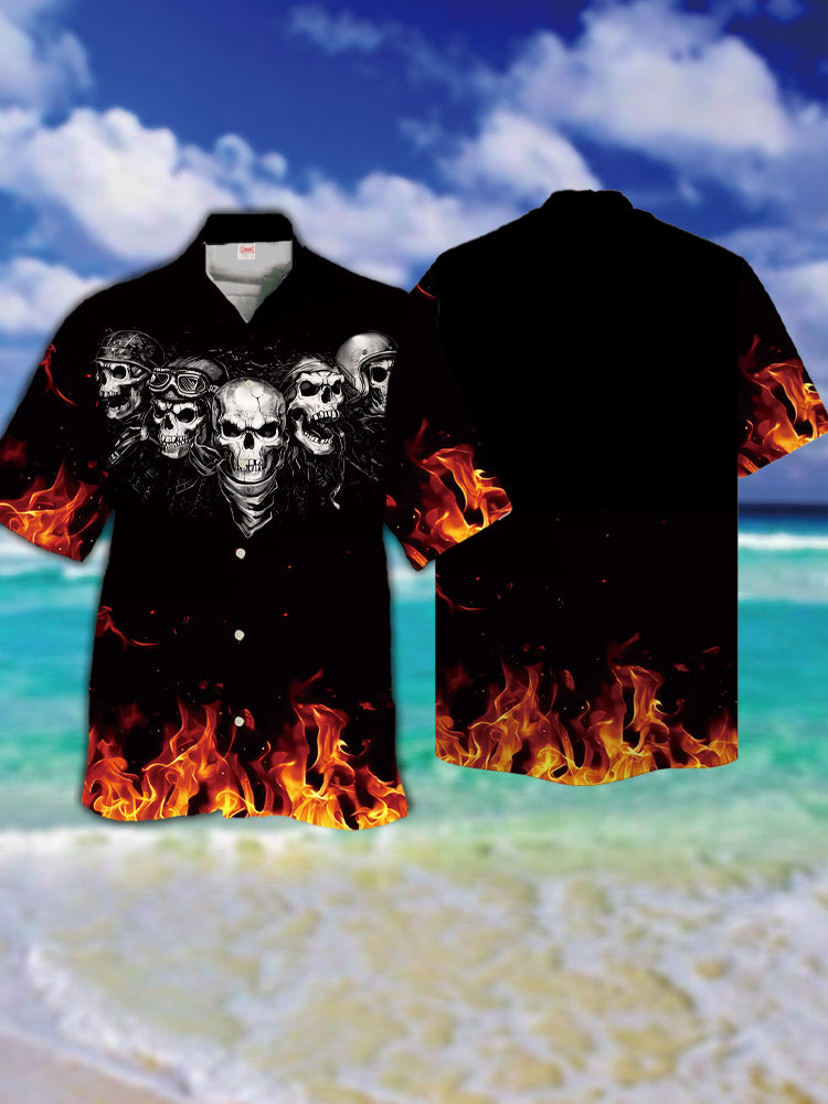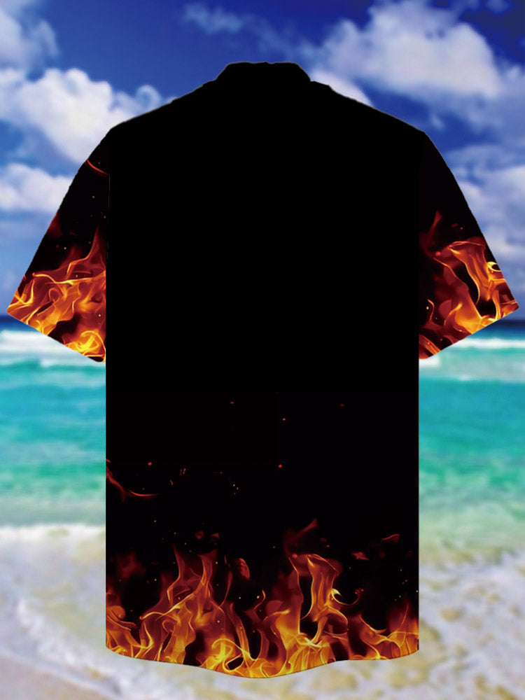 • Eye-Catching Black Awesome Skull With Fire Printing Cuban Collar Hawaiian Short Sleeve Shirt