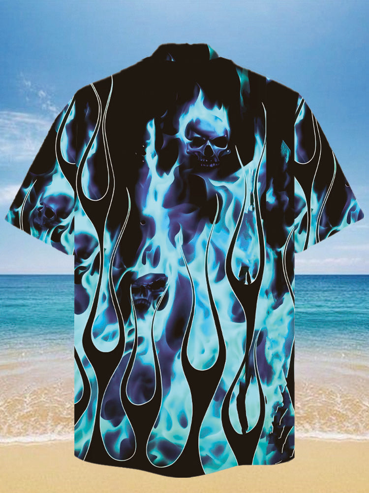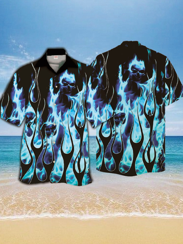 • Eye-Catching Fierce Skull With Blue Flames Burning Printing Cuban Collar Hawaiian Short Sleeve Shirt