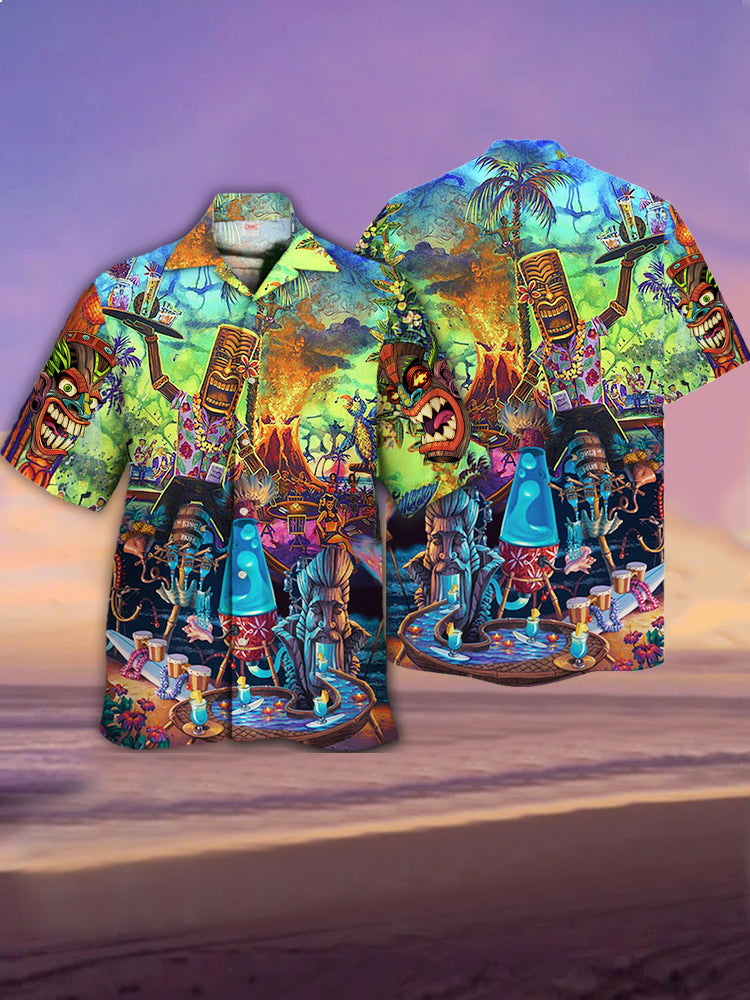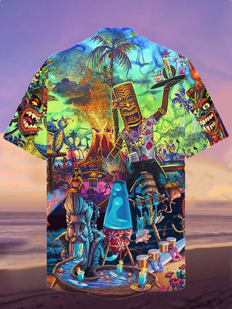 • Eye-Catching Magic Tiki Bar Tiki Waiter Printing Cuban Collar Hawaiian Short Sleeve Shirt
