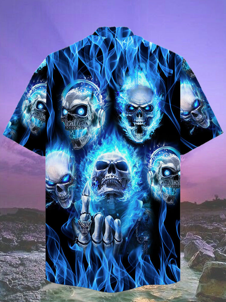• Eye-Catching Amazing Style Blue Electric Flame Skull Printing Cuban Collar Hawaiian Short Sleeve Shirt