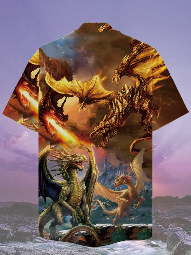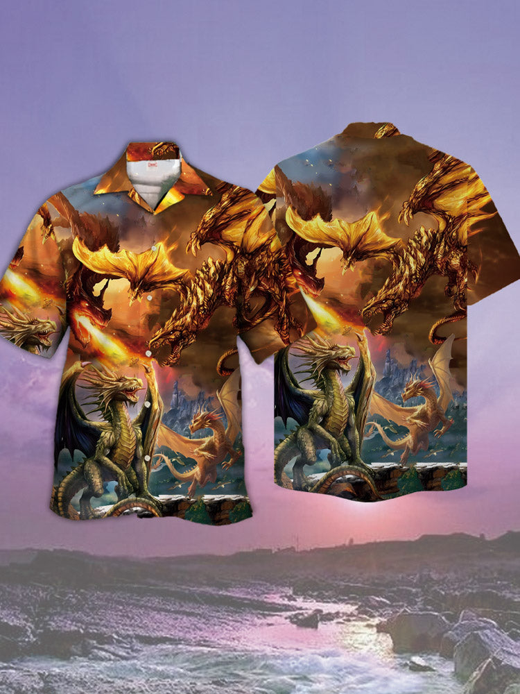 • Eye-Catching Stunning Style Lightning Flame Dragon Fighting Printing Cuban Collar Hawaiian Short Sleeve Shirt