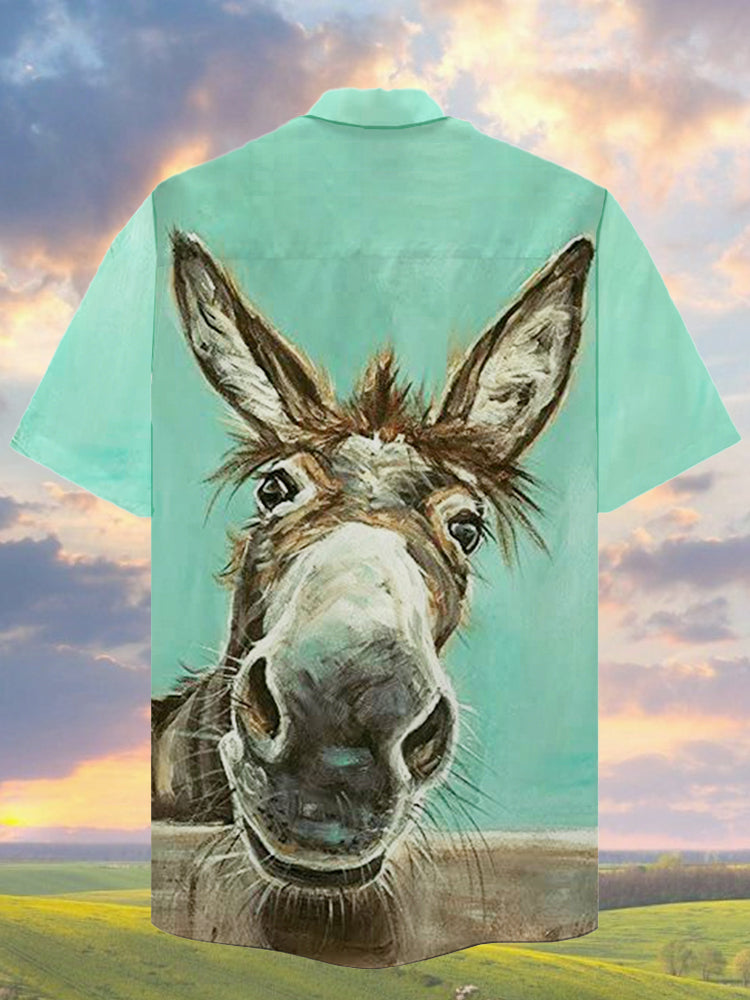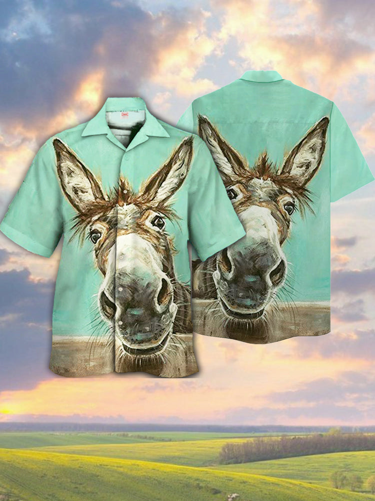 • Eye-Catching Funny Farm Animal Donkey Portrait Printing Cuban Collar Hawaiian Short Sleeve Shirt