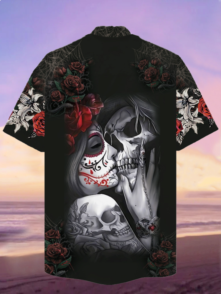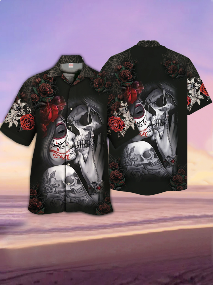 • Eye-Catching Gothic Romantic Kissing Skull And Roses Printing Cuban Collar Hawaiian Short Sleeve Shirt