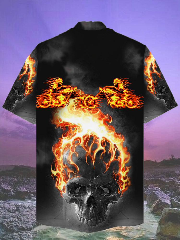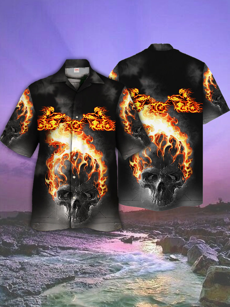 • Eye-Catching Amazing Style Flame Skull With Black Clouds Printing Cuban Collar Hawaiian Short Sleeve Shirt