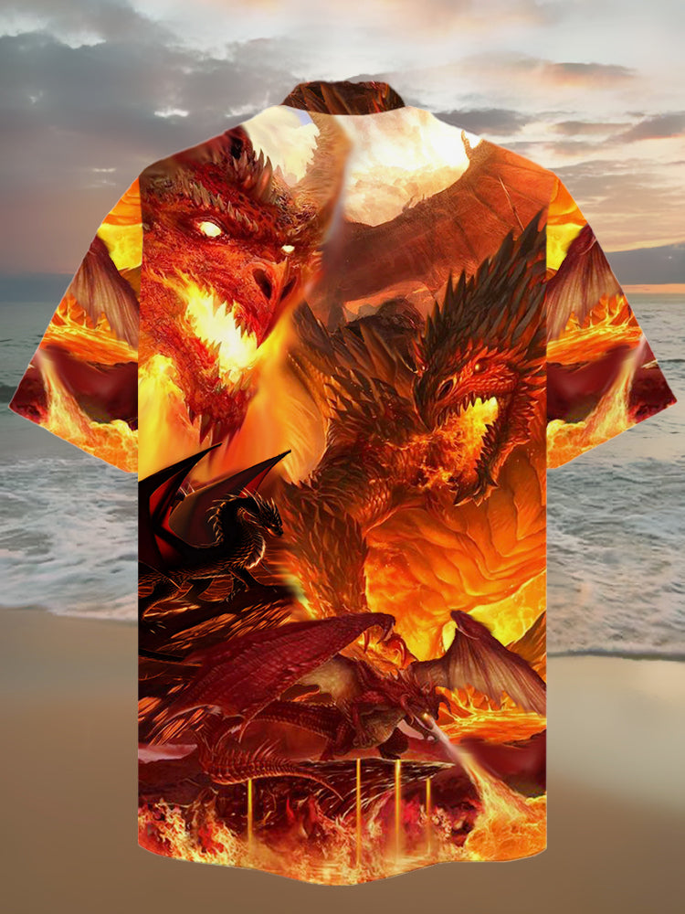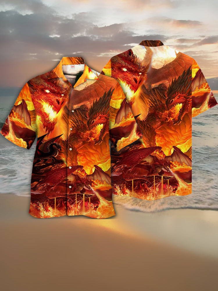 • Eye-Catching Amazing Style Flame Magma And Dragon Printing Cuban Collar Hawaiian Short Sleeve Shirt