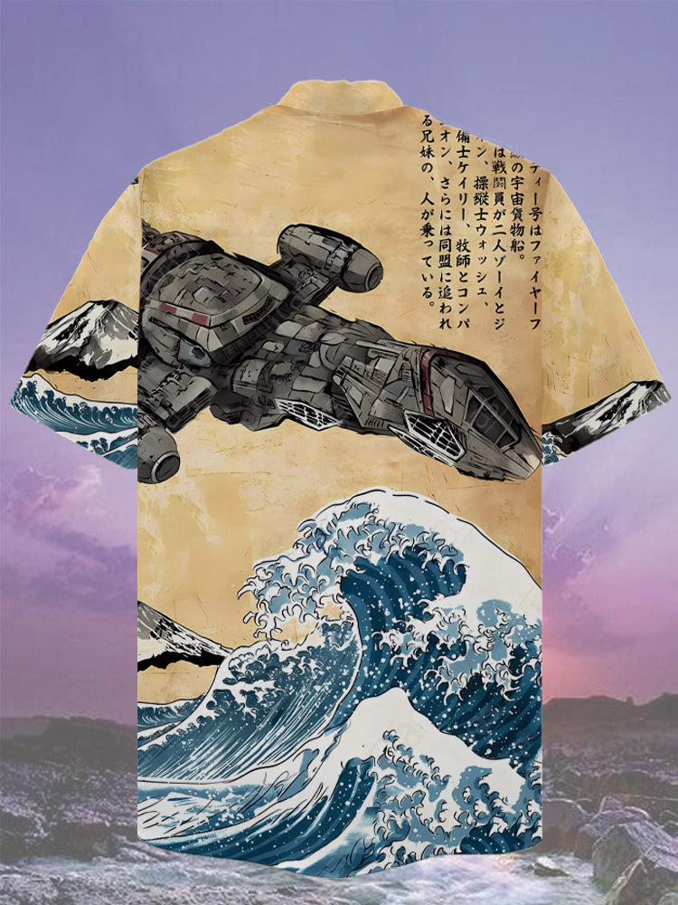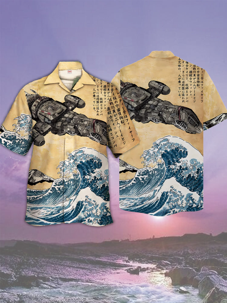 • Eye-Catching Ukiyo-E Air Station With Ocean Waves Personalized Printing Cuban Collar Hawaiian Short Sleeve Shirt
