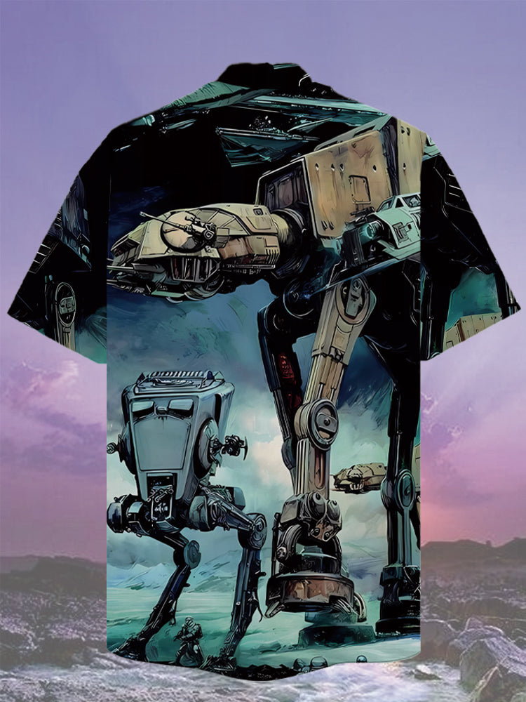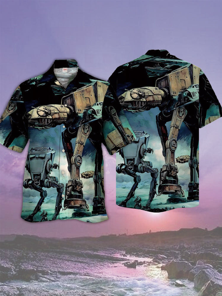 • Eye-Catching Sci-Fi Ancient Armed Walker And Armed Robot Printing Cuban Collar Hawaiian Short Sleeve Shirt
