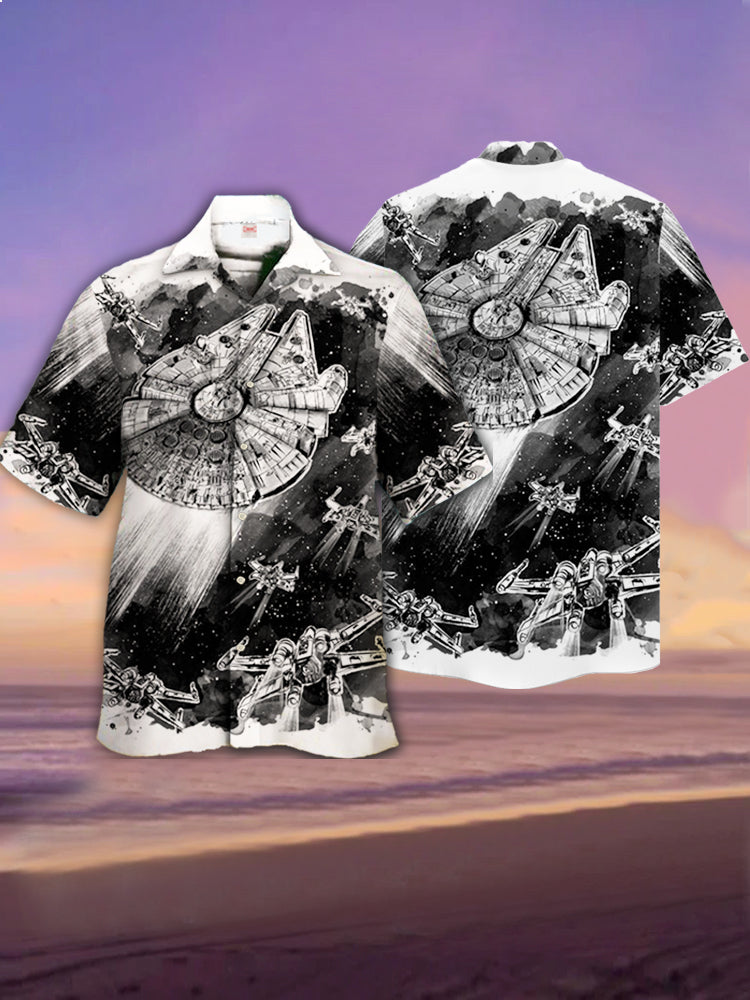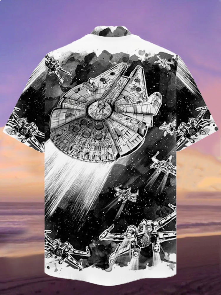 • Eye-Catching Sci-Fi Ink Painting Space Wars Spaceship And Fighter Printing Cuban Collar Hawaiian Short Sleeve Shirt