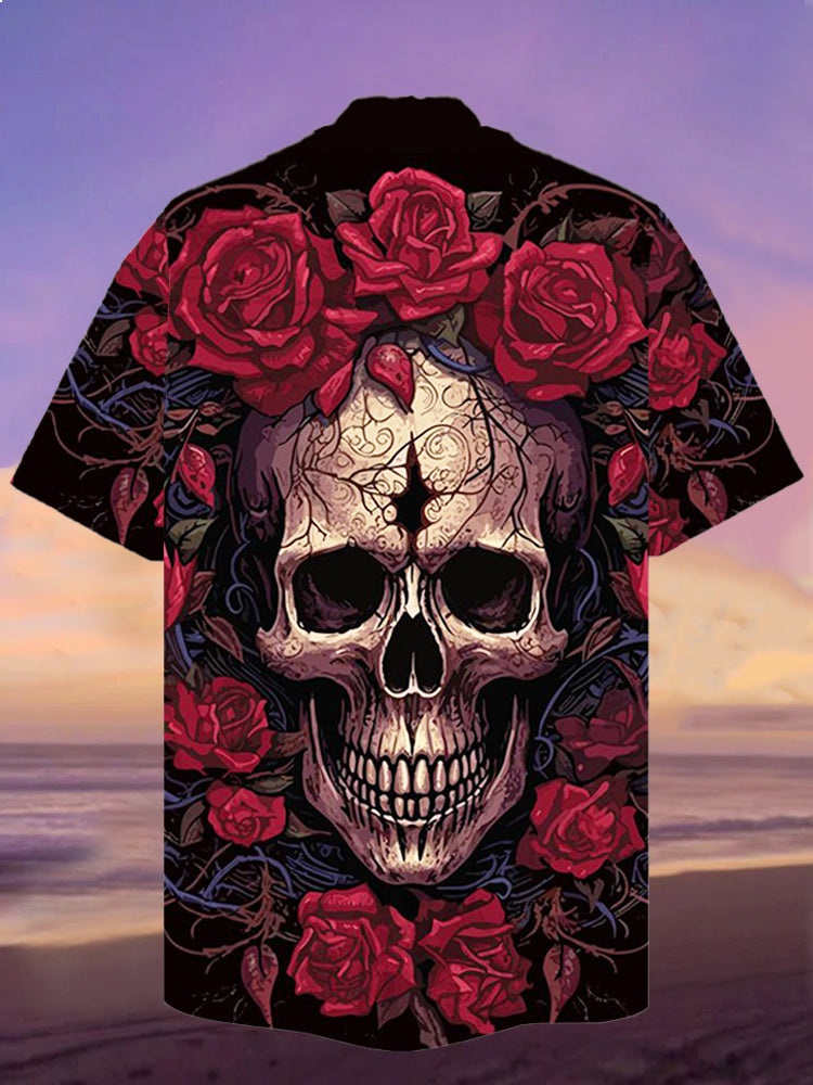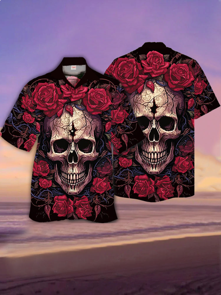• Eye-Catching Gothic Romantic Skull Vines And Red Roses Printing Cuban Collar Hawaiian Short Sleeve Shirt