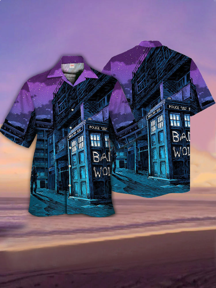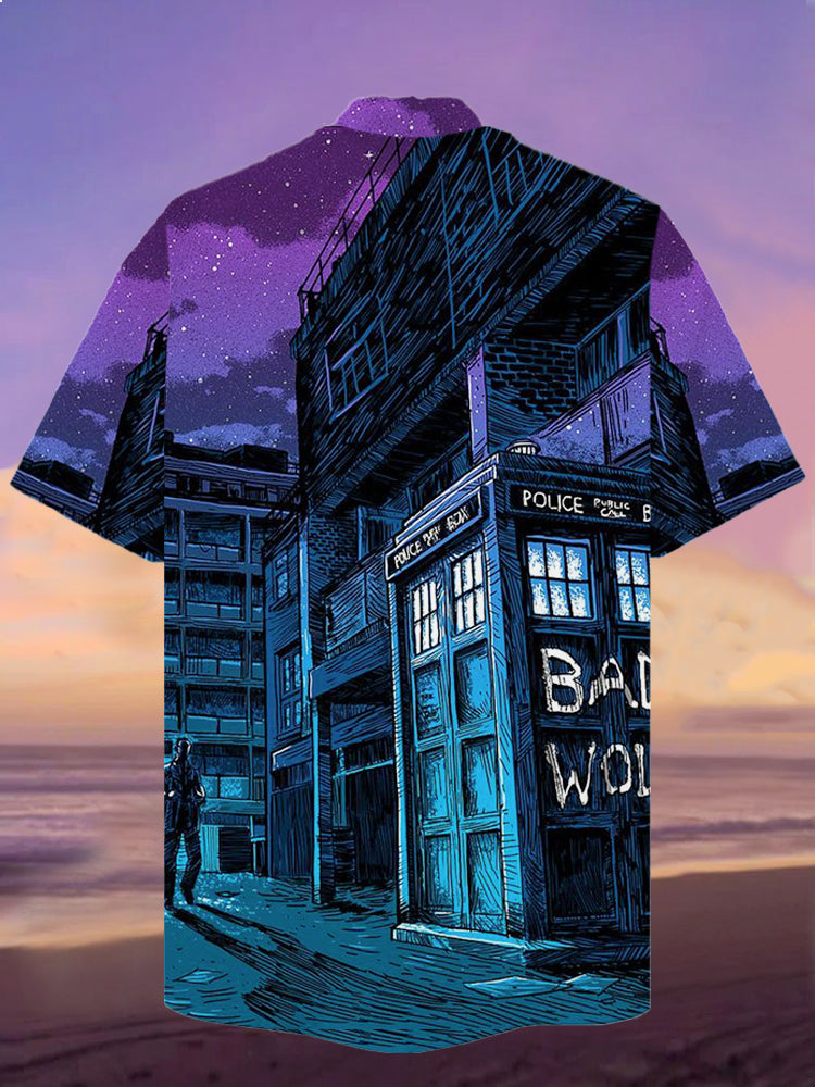 • Eye-Catching Fantasy Purple Starry Sky Broken Building And Time Travel Box Printing Cuban Collar Hawaiian Short Sleeve Shirt
