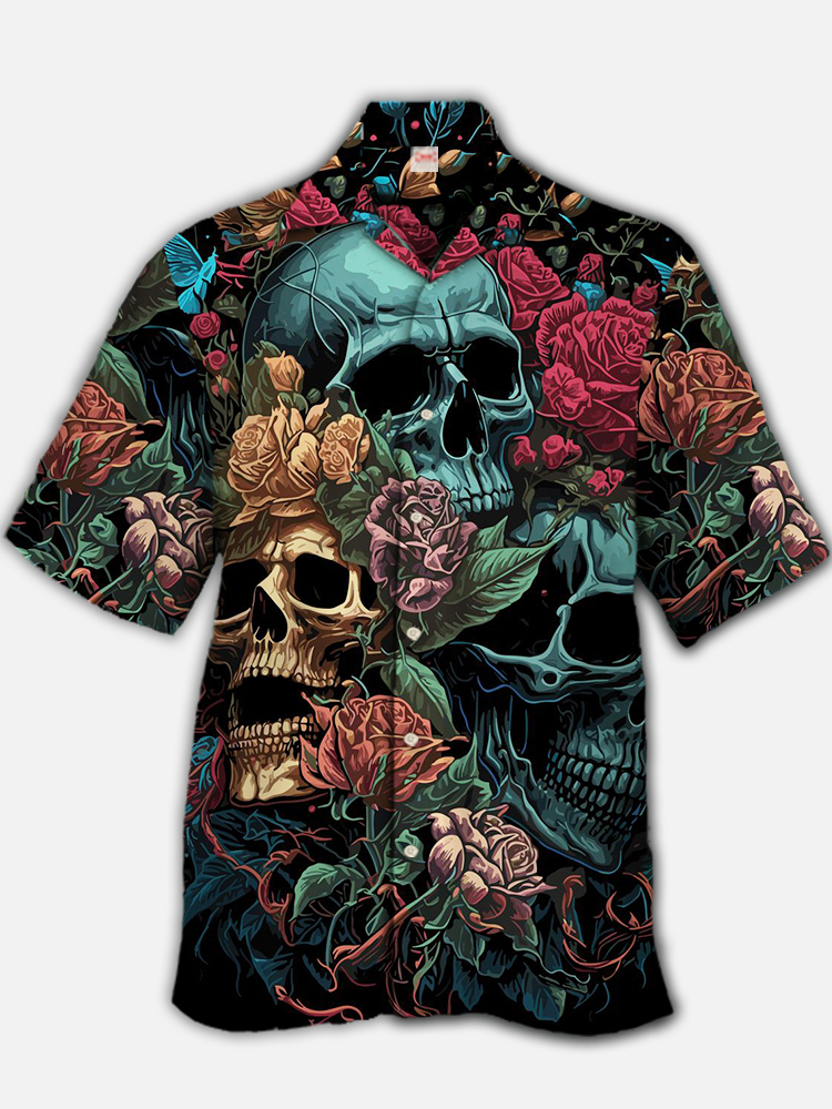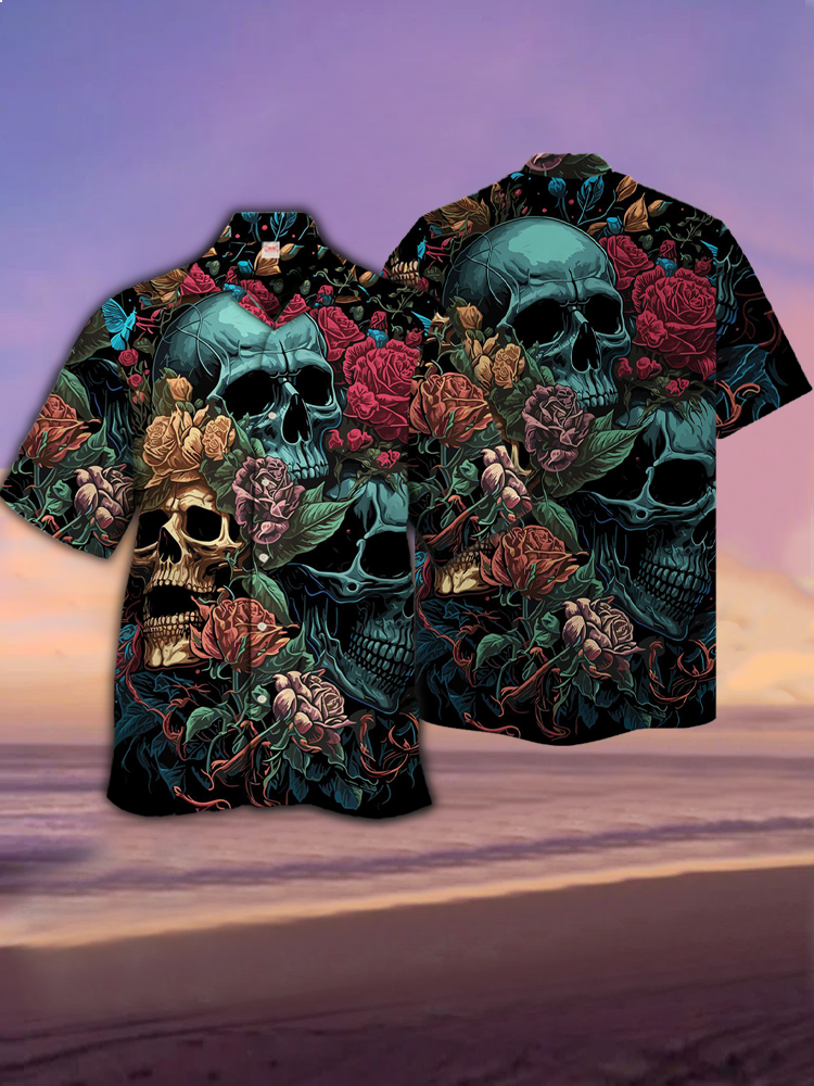 • Eye-Catching Stunning Style Death Metal Skulls And Blooming Flowers Printing Cuban Collar Hawaiian Short Sleeve Shirt