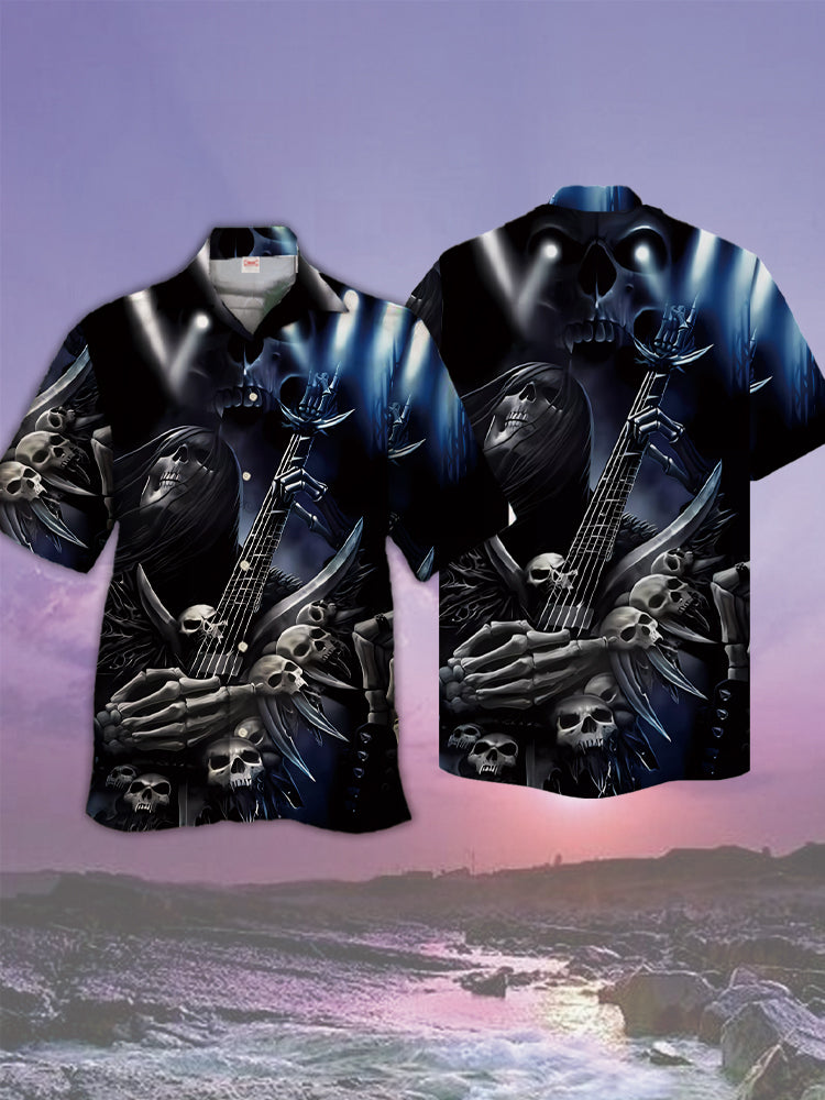 Eye-Catching Death Skull Guitar Music Heavy Metal Rock Printing Cuban Collar Hawaiian Short Sleeve Shirt