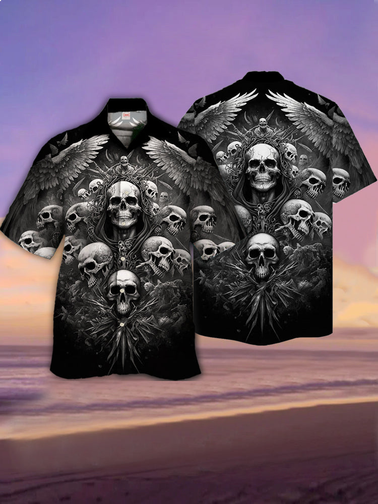 • Eye-Catching Mystical Luxury Grim Reaper Skull Halloween Black Printing Cuban Collar Hawaiian Short Sleeve Shirt