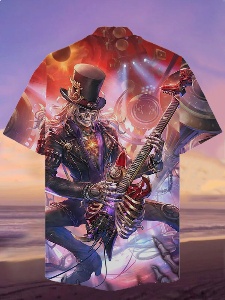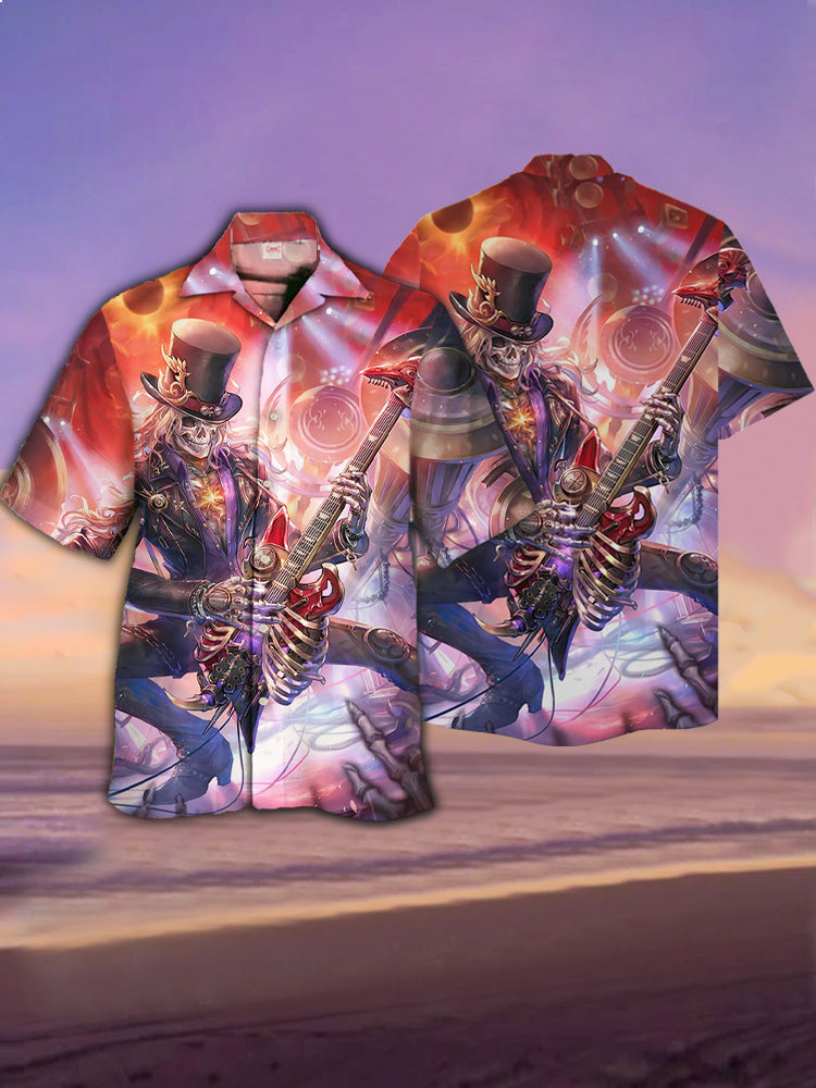 • Eye-Catching Brilliant Stage Heavy Metal Rock Skull Electric Guitarist Printing Cuban Collar Hawaiian Short Sleeve Shirt