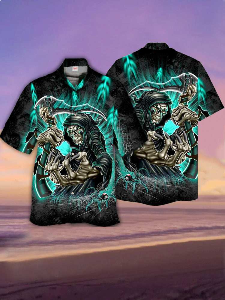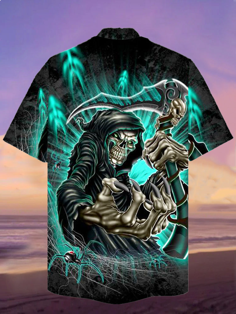• Eye-Catching Neon Cyan Light Scythe Skull Black Robe Grim Reaper Printing Cuban Collar Hawaiian Short Sleeve Shirt