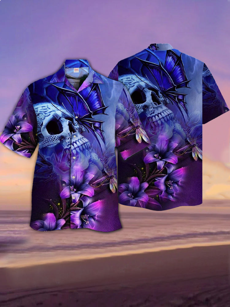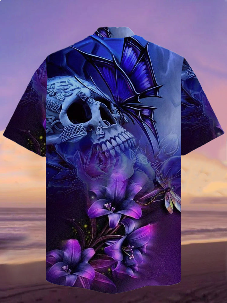 • Eye-Catching Psychedelic Gradient Purple Magic Butterfly Flowers And Skull Printing Cuban Collar Hawaiian Short Sleeve Shirt