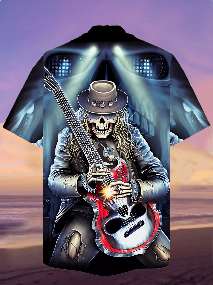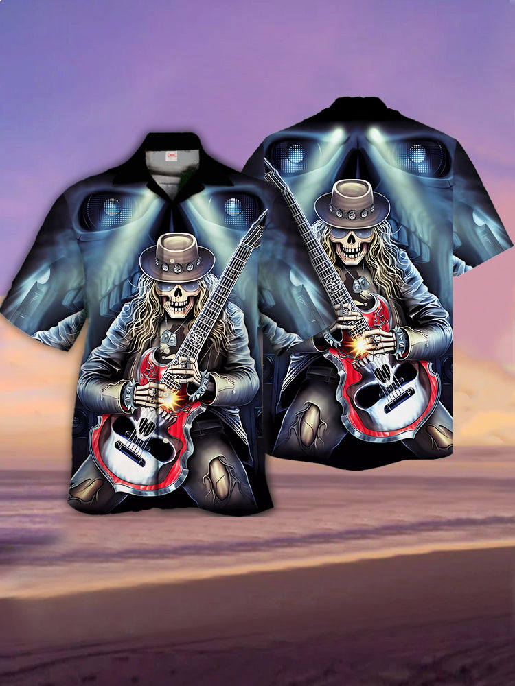 • Eye-Catching Heavy Metal Rock Skeleton Light Stage And Grim Reaper Electric Guitarist Printing Cuban Collar Hawaiian Short Sleeve Shirt