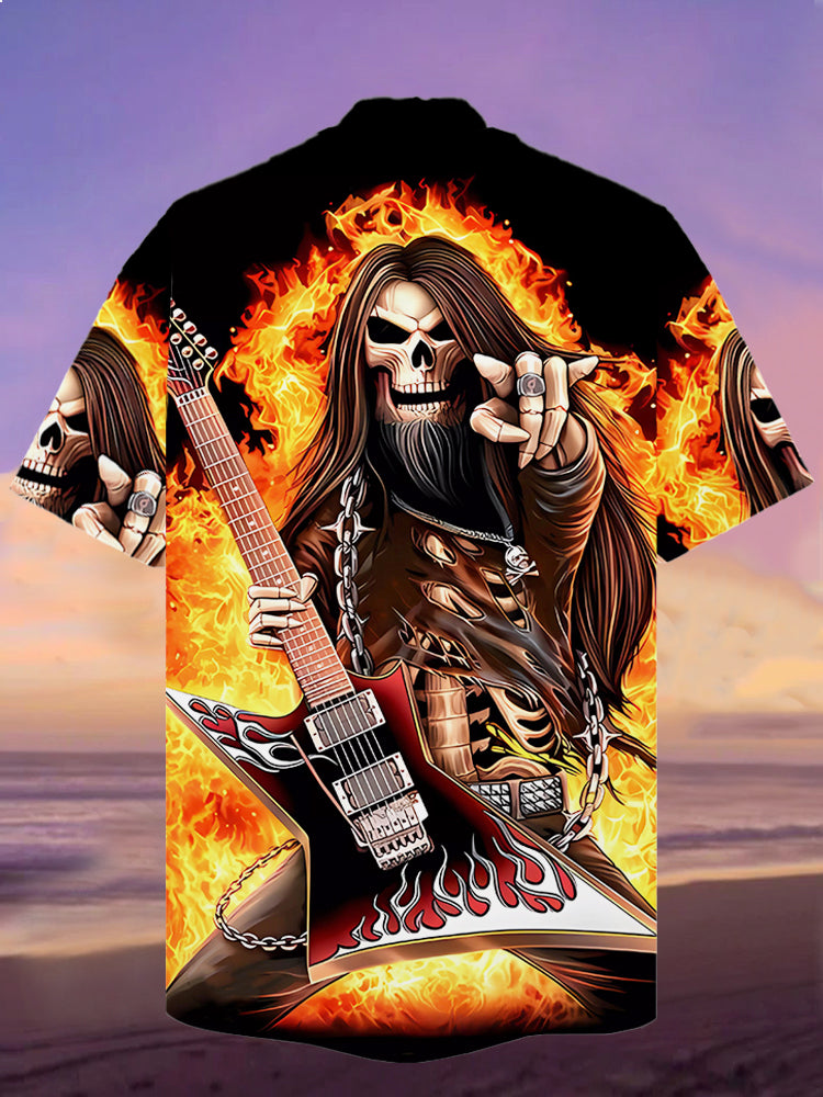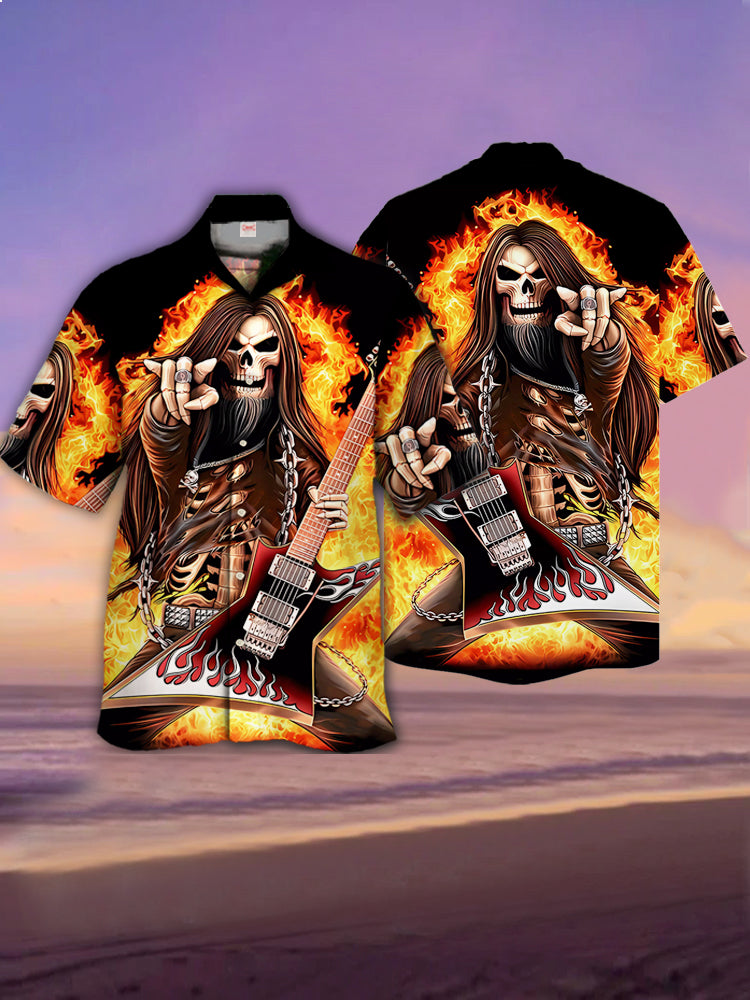 Eye-Catching Fire Burning Long Hair Skull Heavy Metal Rock Printing Cuban Collar Hawaiian Short Sleeve Shirt
