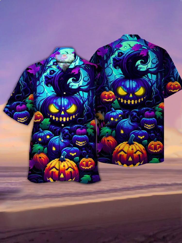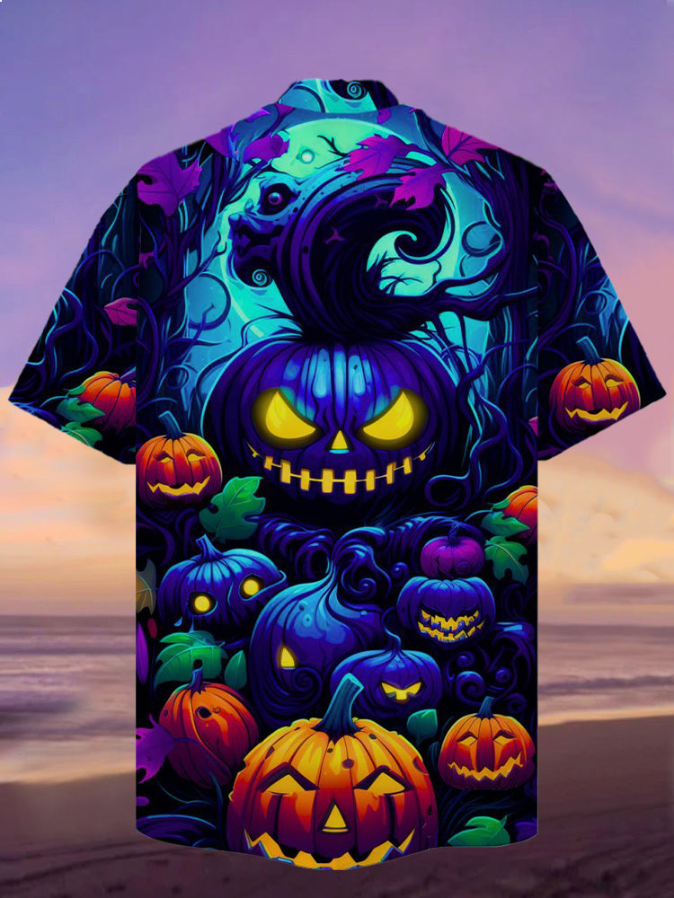 • Eye-Catching Halloween Night Psychedelic Evil Pumpkin Forest Printing Cuban Collar Hawaiian Short Sleeve Shirt