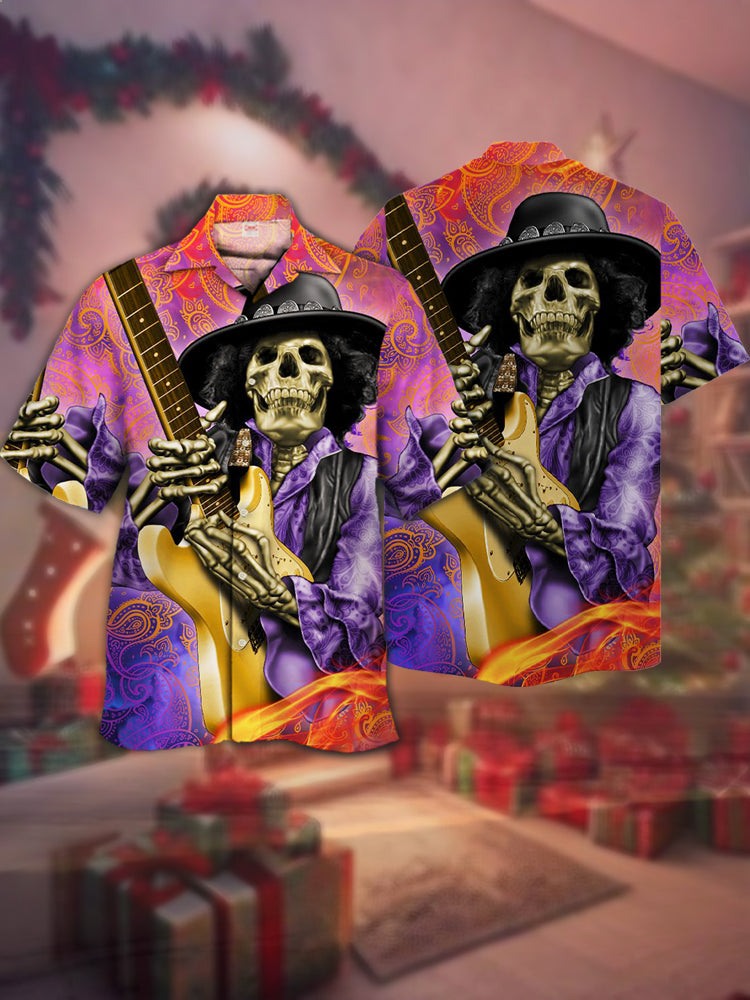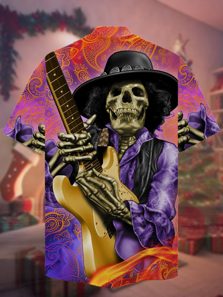 • Eye-Catching Skull Punk Rock Guitarist Printing Cuban Collar Hawaiian Short Sleeve Shirt