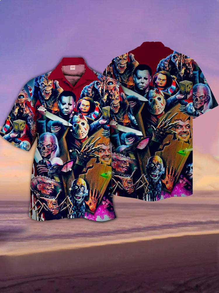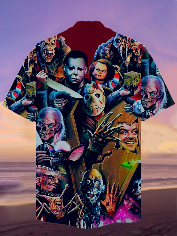 • Eye-Catching Halloween Psychedelic Evil Horror Movie Characters Printing Cuban Collar Hawaiian Short Sleeve Shirt