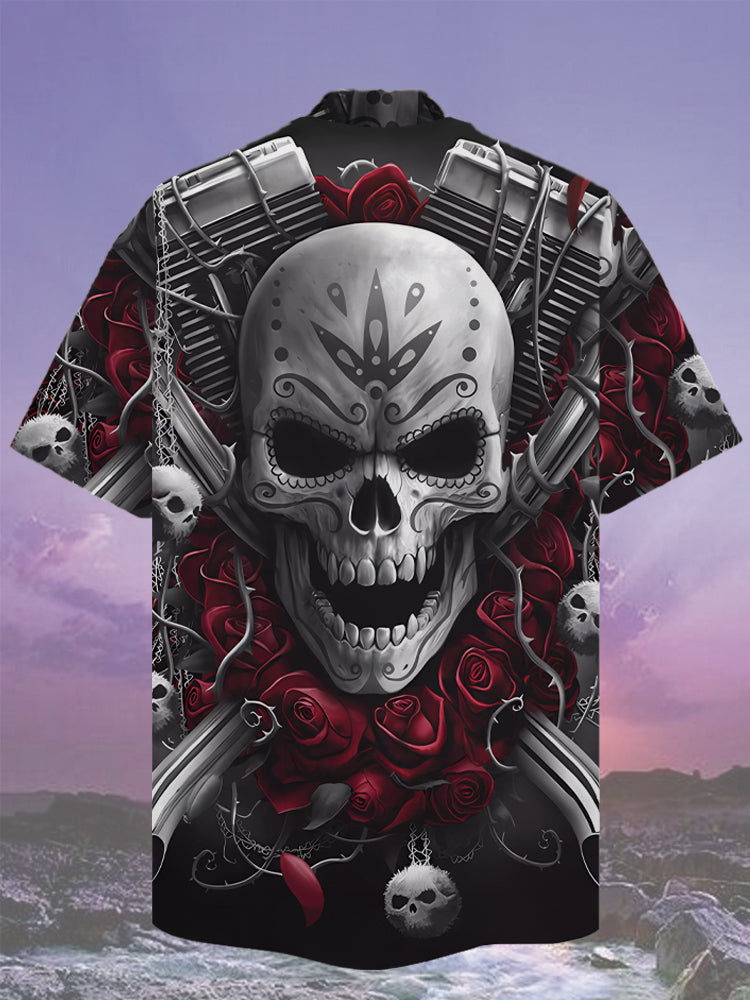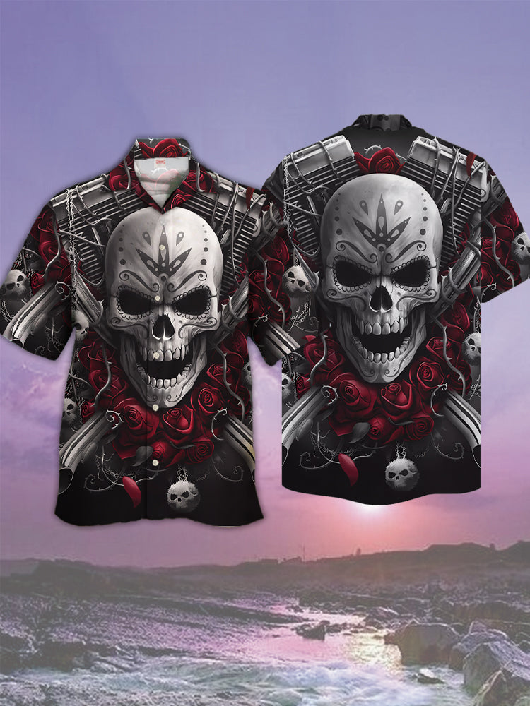 • Eye-Catching Horror Ghost Skulls And Roses Printing Cuban Collar Hawaiian Short Sleeve Shirt