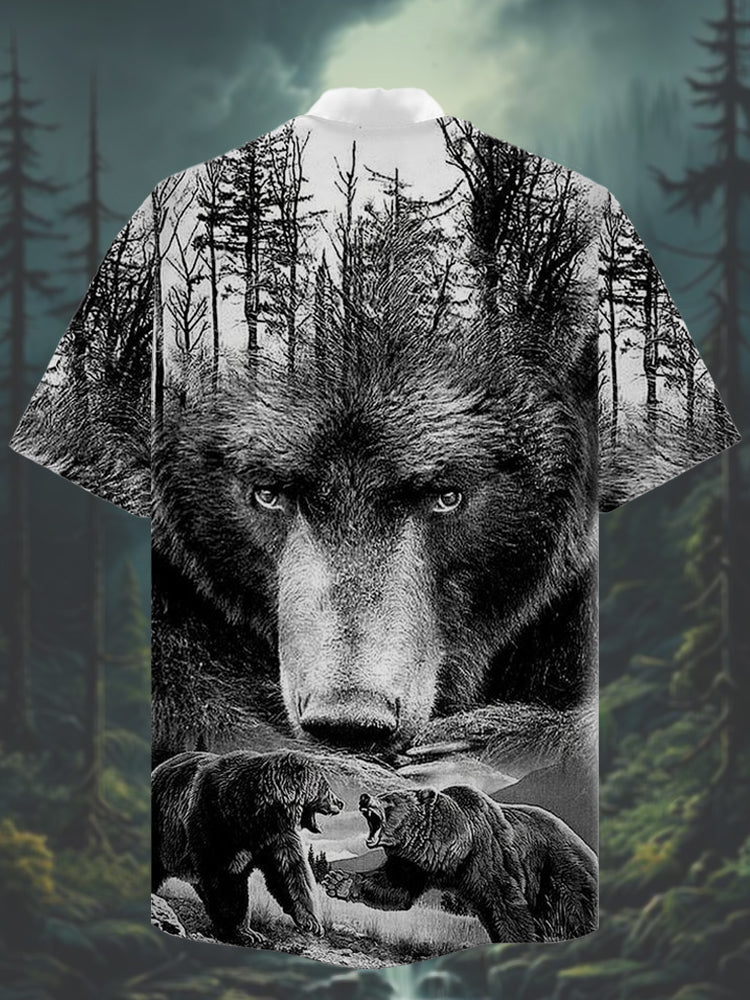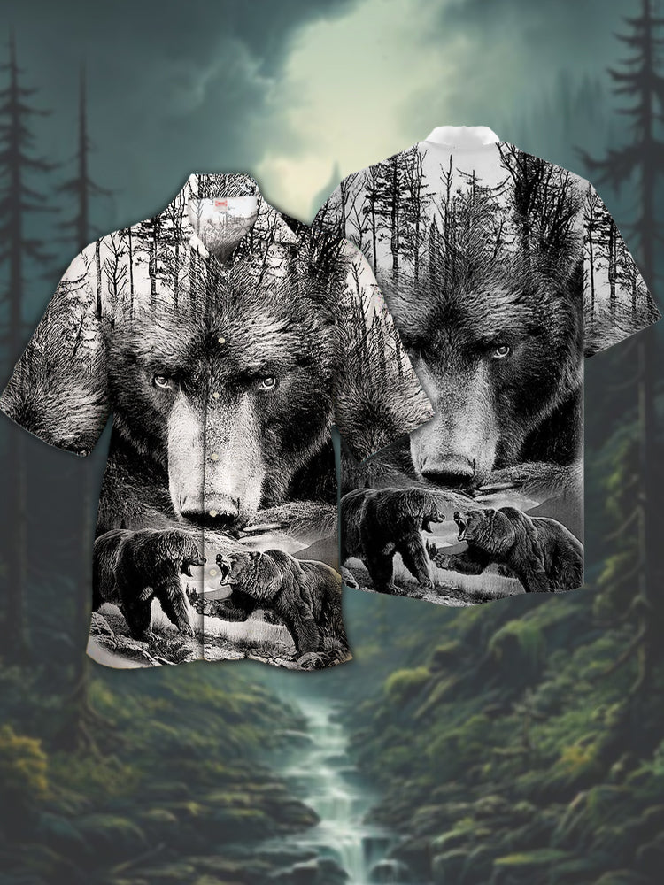 • Eye-Catching Black And White Domineering Forest Brown Bears Printing Cuban Collar Hawaiian Short Sleeve Shirt