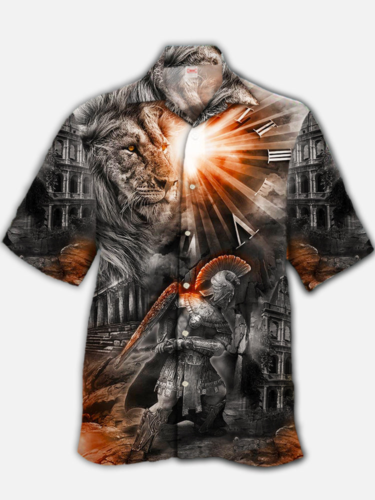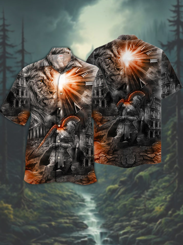 Eye-Catching Black And White Domineering Lion And Samurai Printing Cuban Collar Hawaiian Short Sleeve Shirt