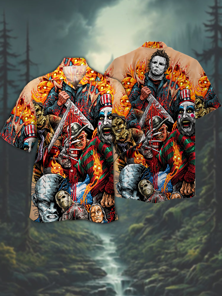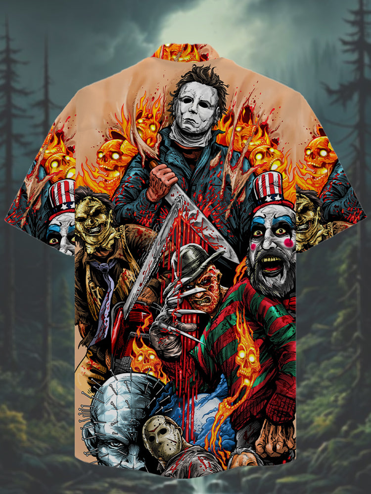 • Eye-Catching Thriller Style Horror Characters And Flaming Skulls Costumes Printing Cuban Collar Hawaiian Short Sleeve Shirt